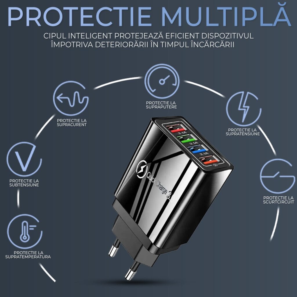 - 4 Porturi de incarcare: Dispune de un port Quick Charge 3.0 USB pentru incarcare rapida si alte trei porturi USB standard, permitandu-ti sa incarci simultan pana la patru dispozitive.