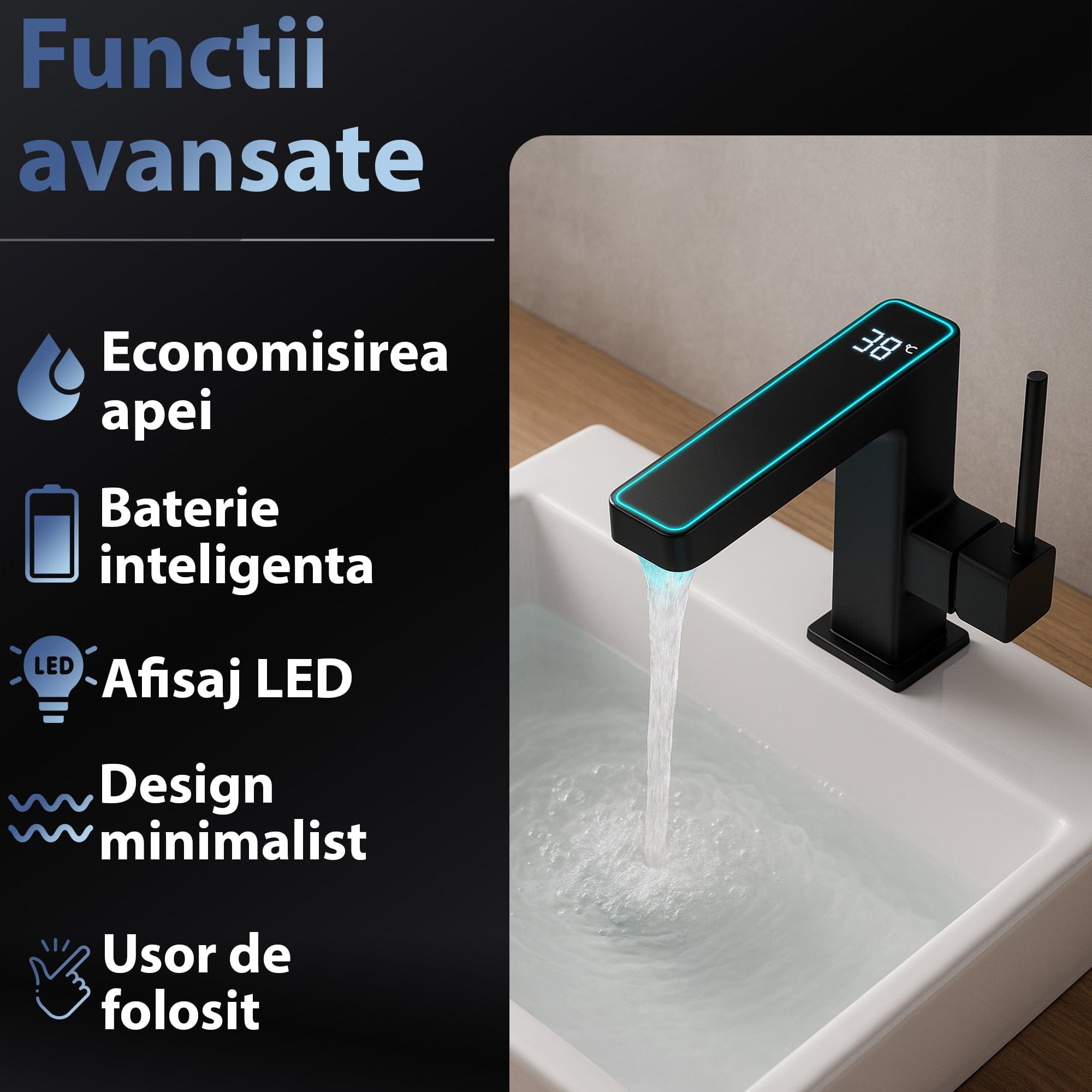 ⚡ Baterie Lavoar cu Afisaj Digital LED Temperatura – Montaj Pe Blat, Design Patrat, Monocomanda, Alama Solida, Hidroelectrica fara Baterii, Negru Mat ⚡