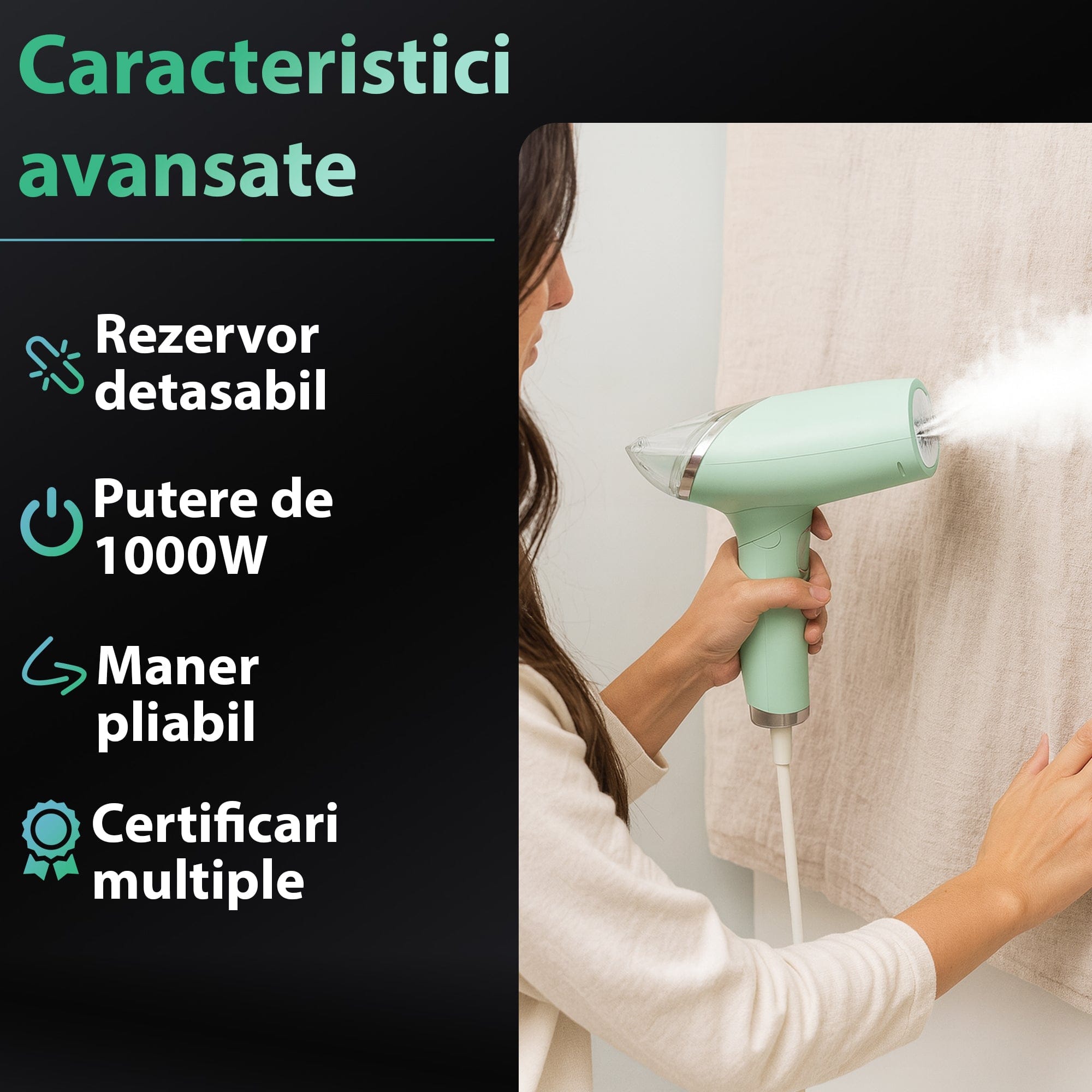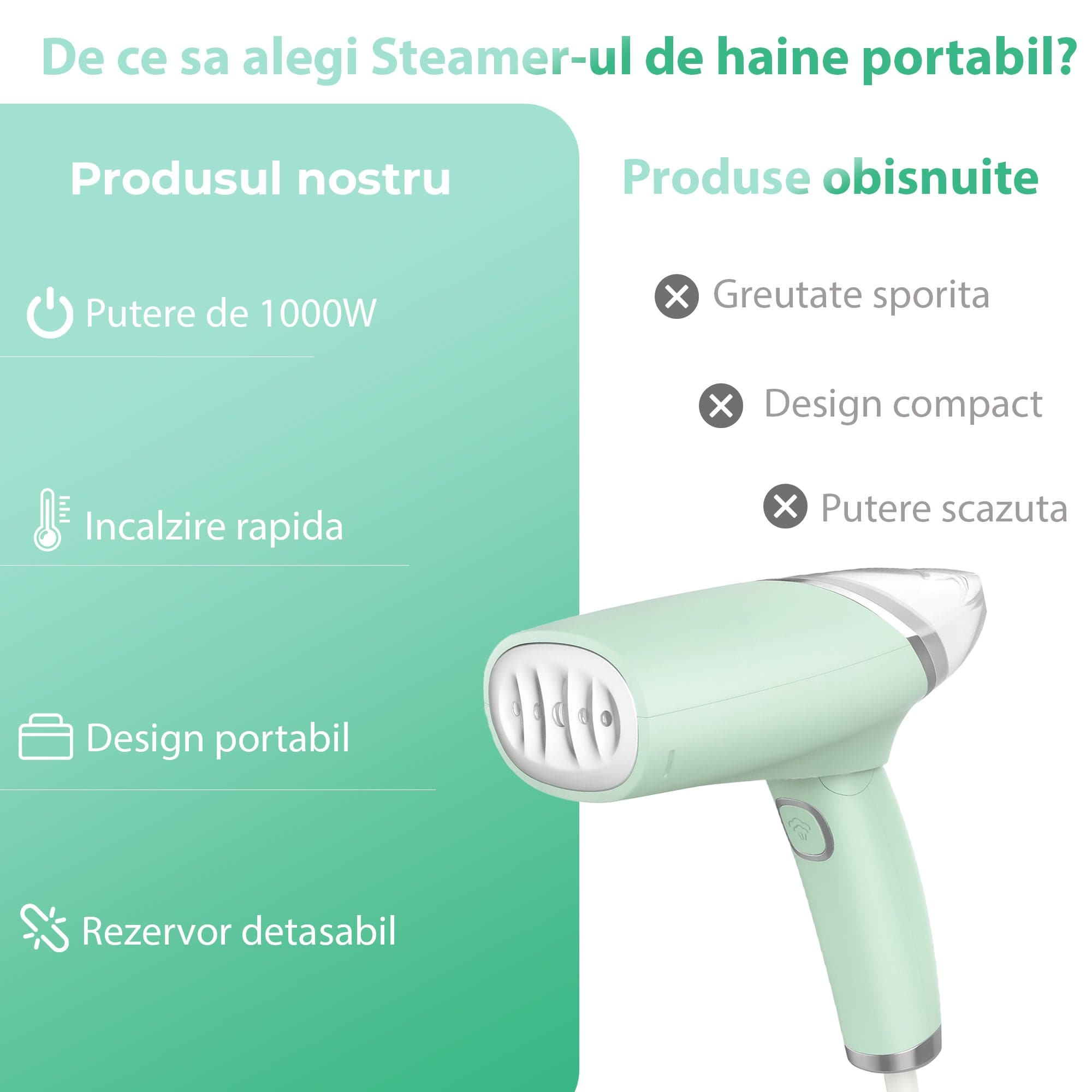 Steamer de Haine Portabil – 1000W, Compact si Pliabil, Incalzire Rapida 35 secunde, Rezervor Detasabil, Potrivit pentru o varietate de tesaturi, Ideal pentru Casa, Birou sau Bagaj de Mana, Verde