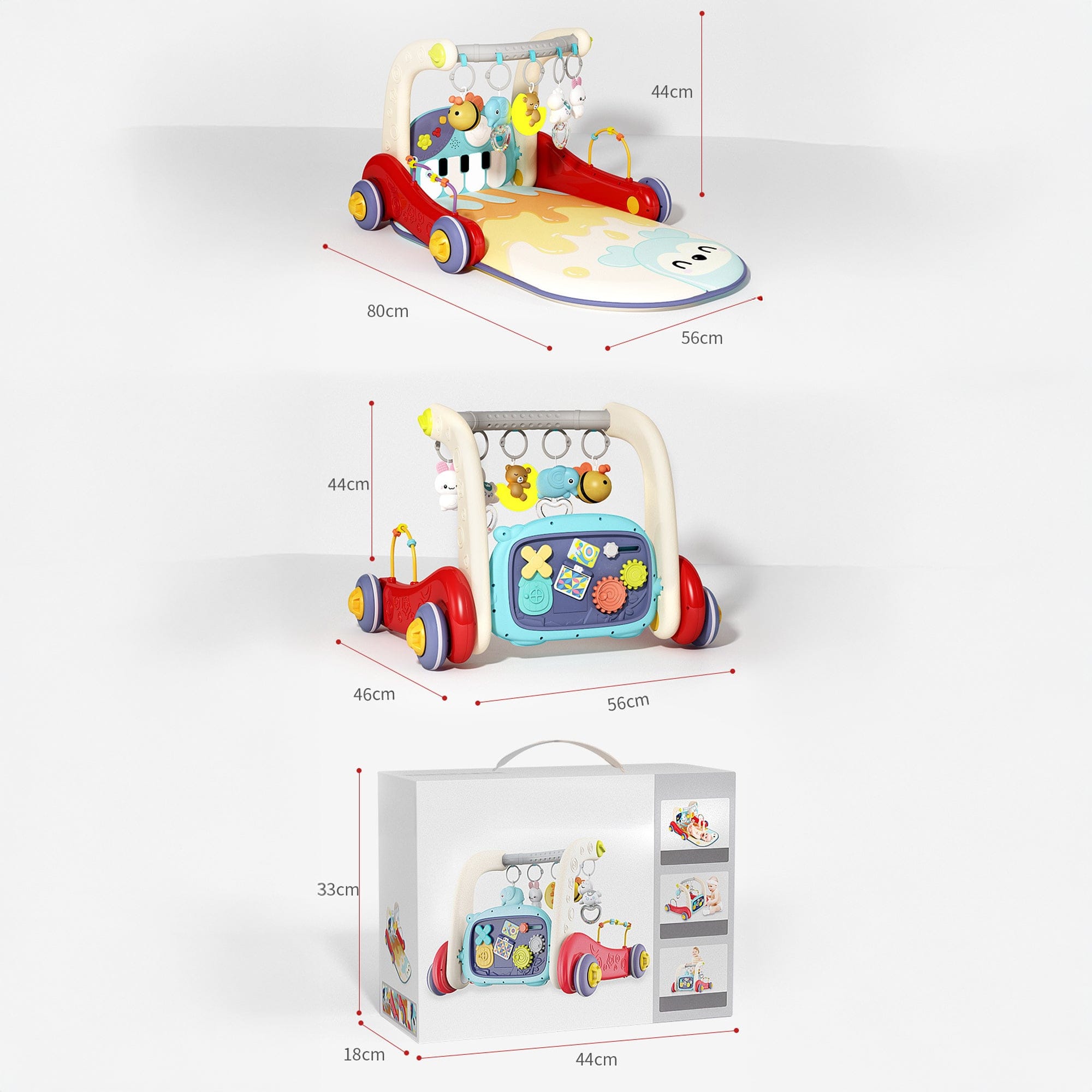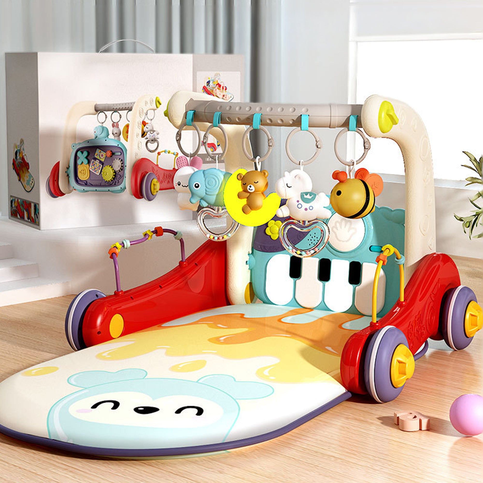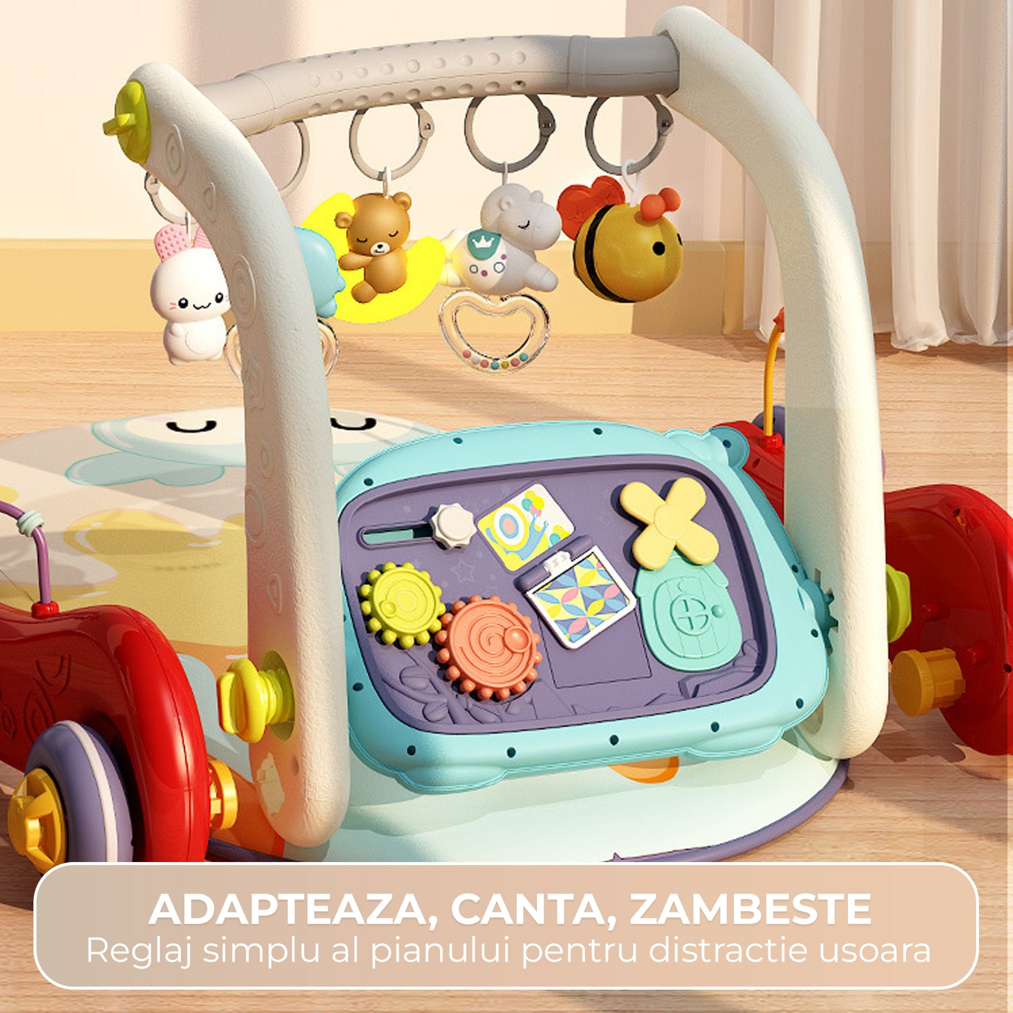 Transforma timpul petrecut pe salteluta bebelusi intr-o experienta completa: pian pentru ritm, povesti pentru linistire, lumina de noapte pentru rutina si circuit cu bile pentru coordonare. Pe masura ce creste, micutul exploreaza centrul 4-in-1 si exerseaza primii pasi cu suportul elementelor tip premergator, capatand incredere si echilibru.