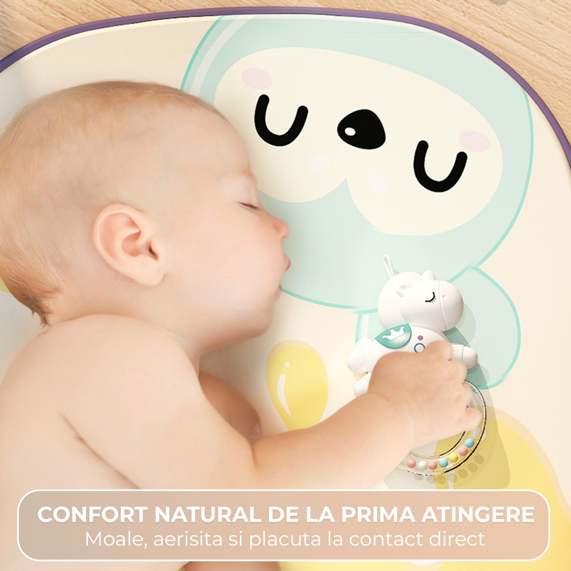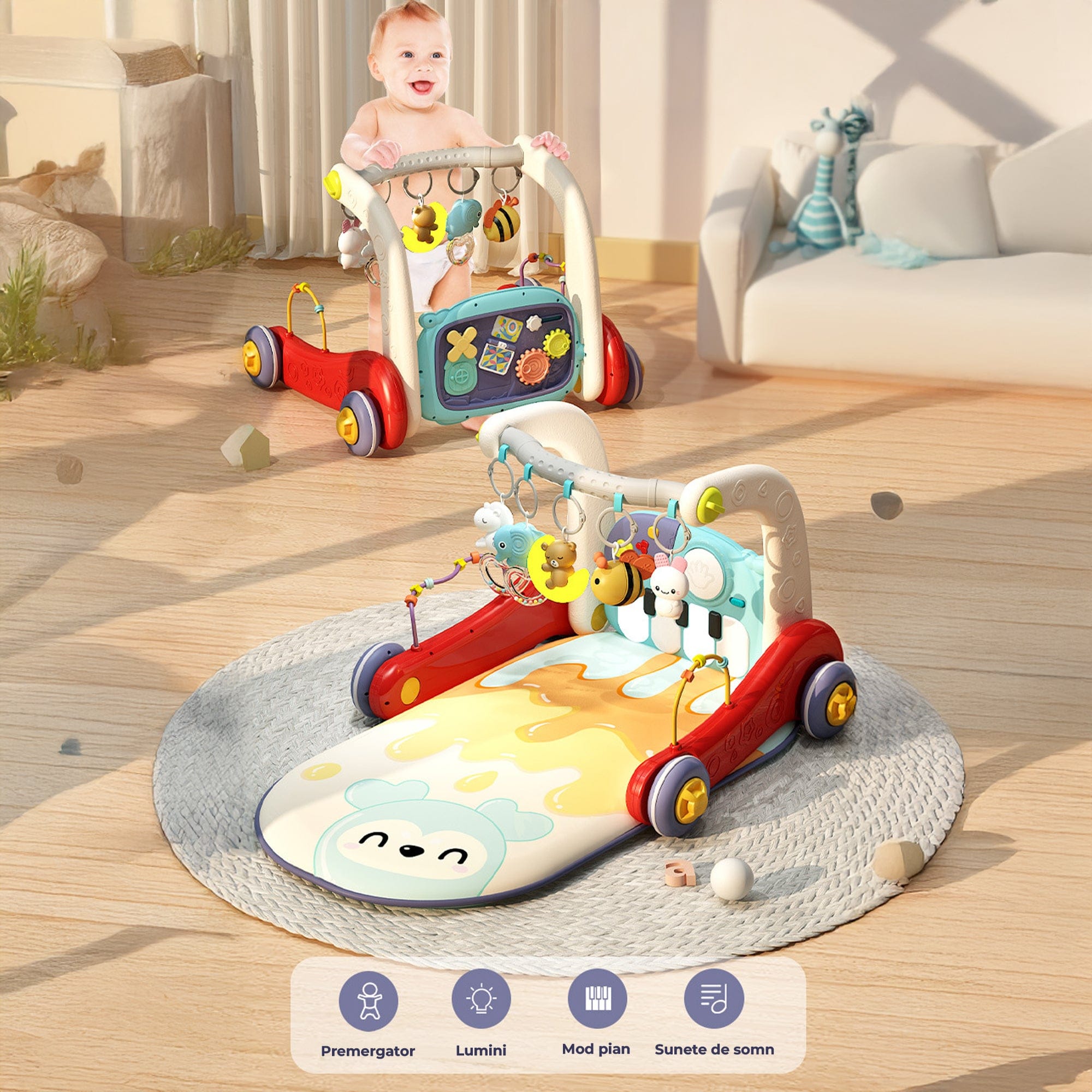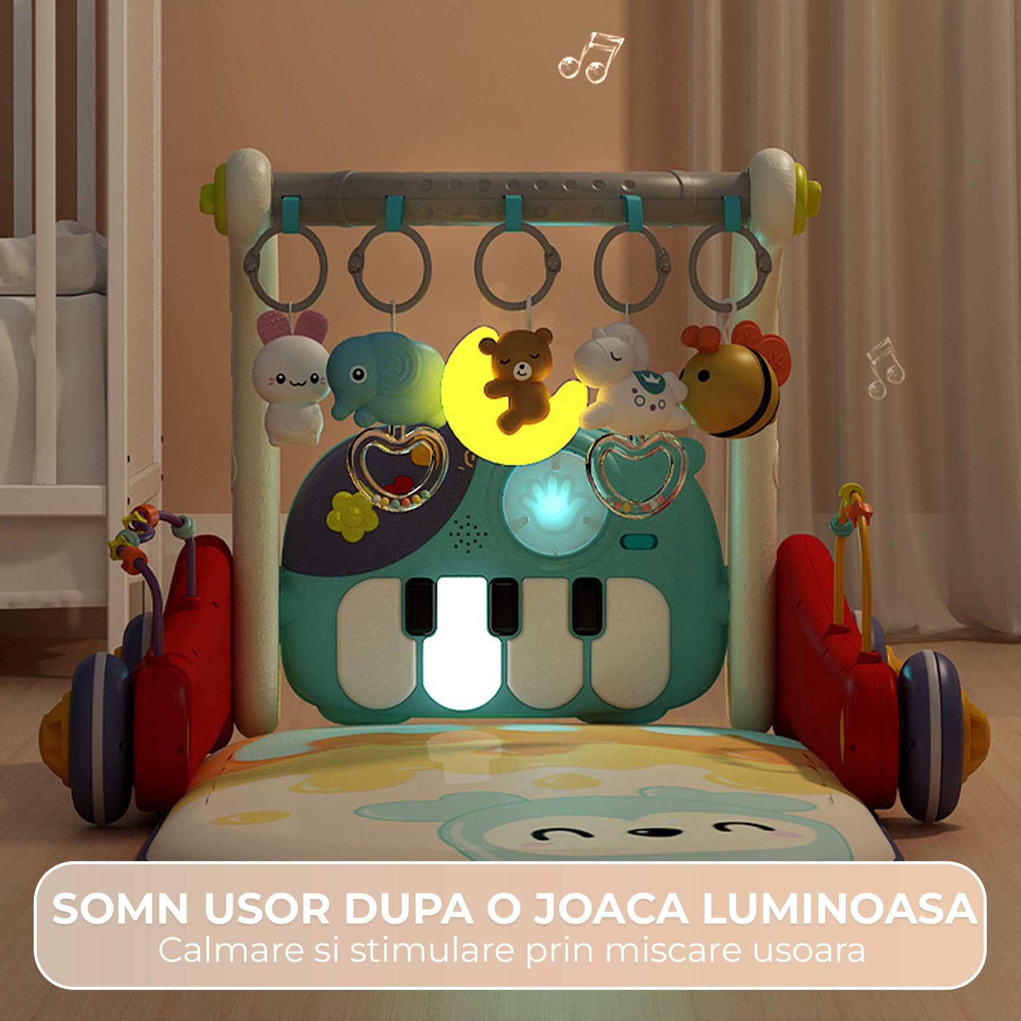 • Stimulare auditiva si vizuala: pian cu sunete prietenoase, povesti si lumina de noapte pentru rutina de seara.