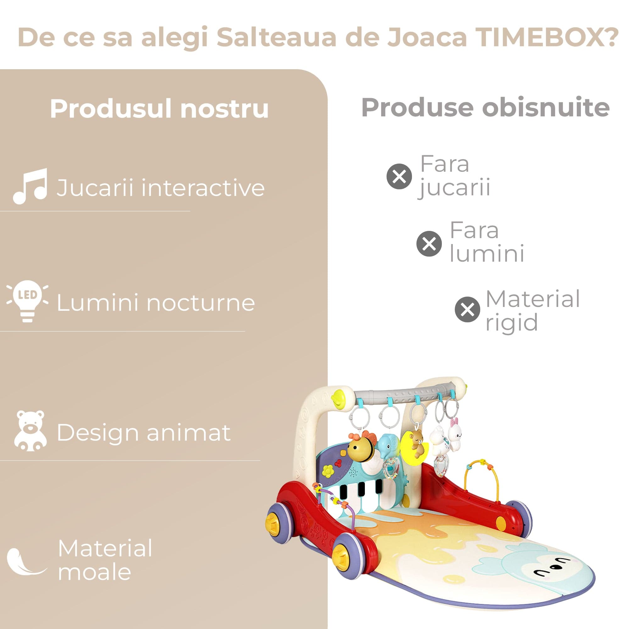 Pentru primele luni si pana la 3 ani, ai un spatiu complet de explorare care combina joaca, linistirea si invatarea. Salteluta bebelusi ofera suprafata moale pentru timp pe burtica, iar centrul 4-in-1 aduce stimulare auditiva si vizuala. Pianul cu sunete blande incurajeaza descoperirea cauzei si efectului, in timp ce lumina de noapte creeaza ambient calm pentru rutina de seara. Traseul cu circuit cu bile sustine urmarirea vizuala si coordonarea mana-ochi, iar arhitectura de centru multifunctional permite adaptarea activitatilor pe masura ce copilul creste. Fiecare modul ofera feedback imediat: apesi, auzi, vezi si inveti, intr-un cadru sigur si prietenos – exact ce iti doresti de la o salteluta bebelusi moderna.