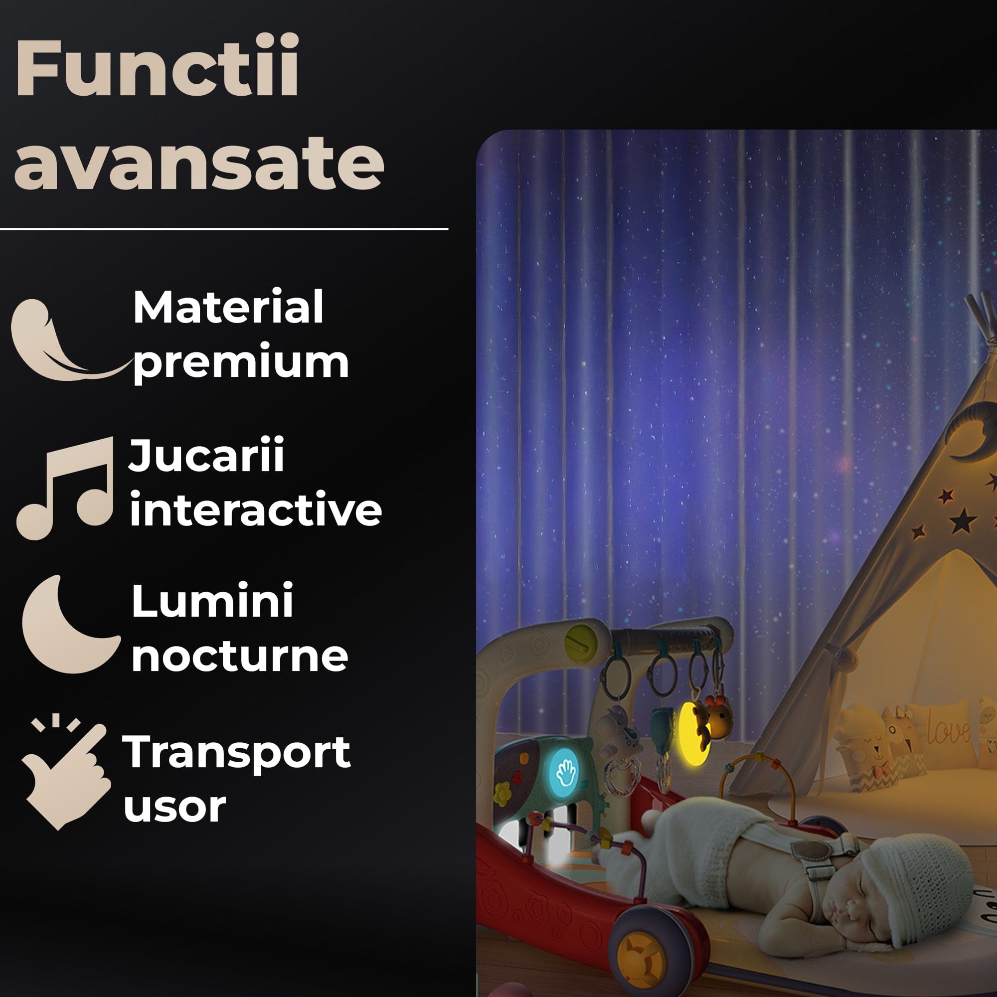 ⚡ Salteluta Centru Multifunctional 4-in-1 Bebelusi – lumina de noapte, pian, povesti, circuit cu bile ⚡