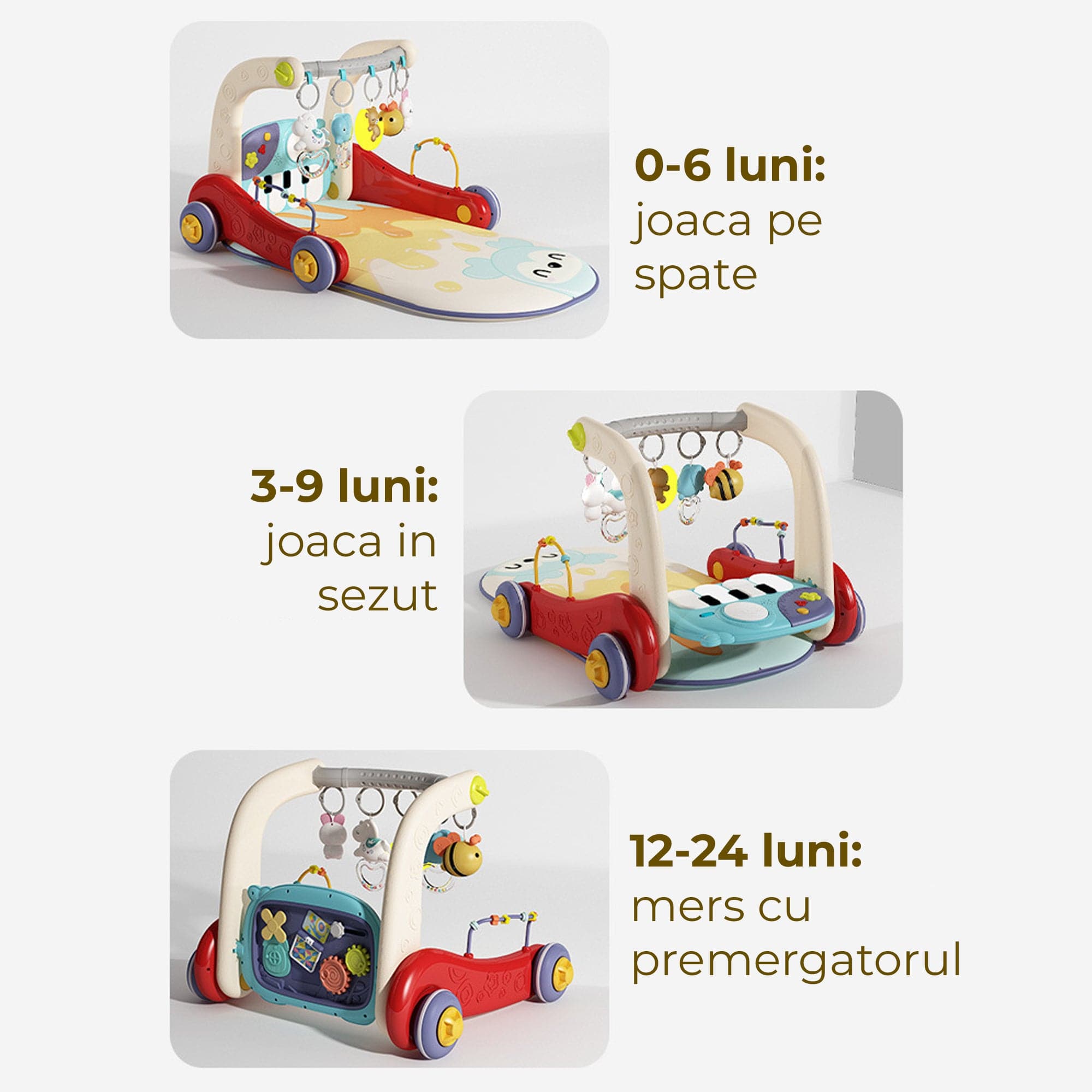 • Dezvoltare pe etape: sustine joaca pe burtica, in sezut si primii pasi, cu stimulare senzoriala si motricitate fina.