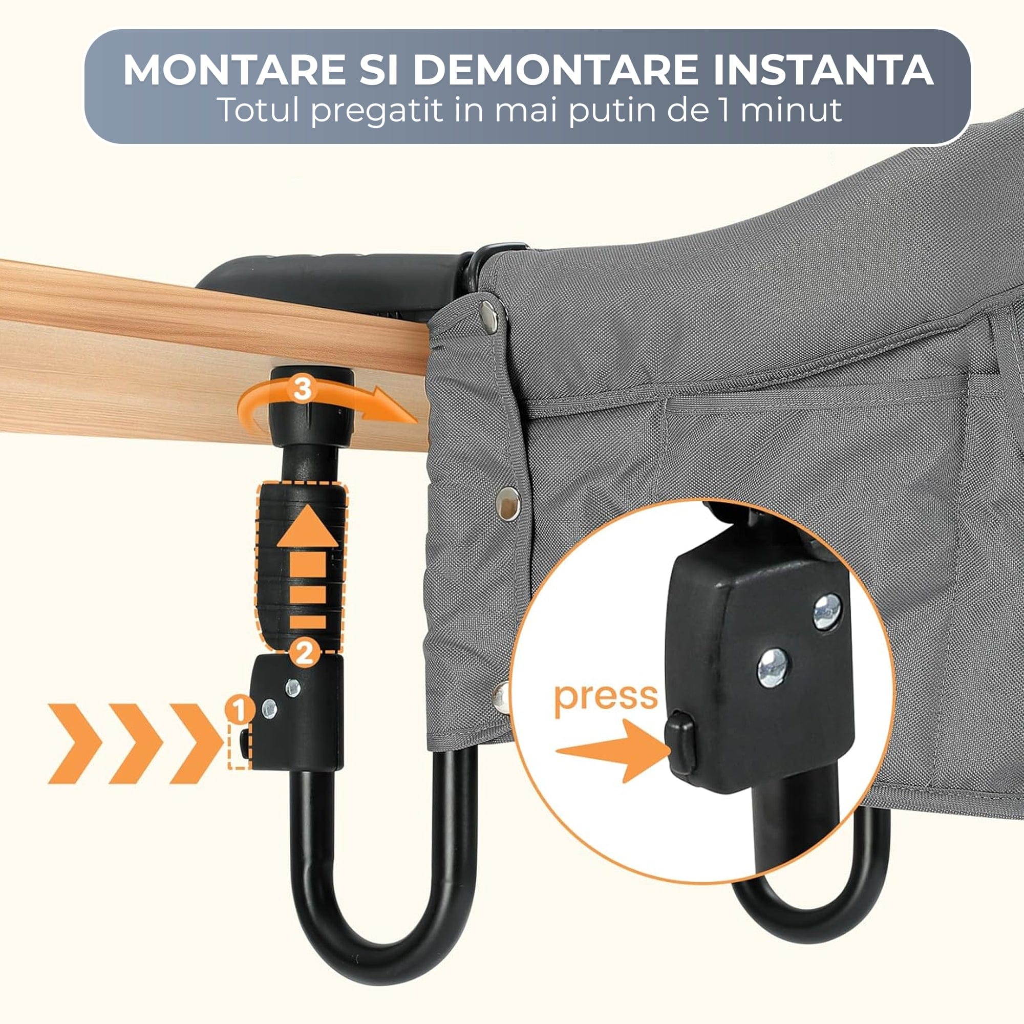 ⚡ Scaun masa portabil copii, prindere pe masa, pliabil, cadru metalic, gri ⚡