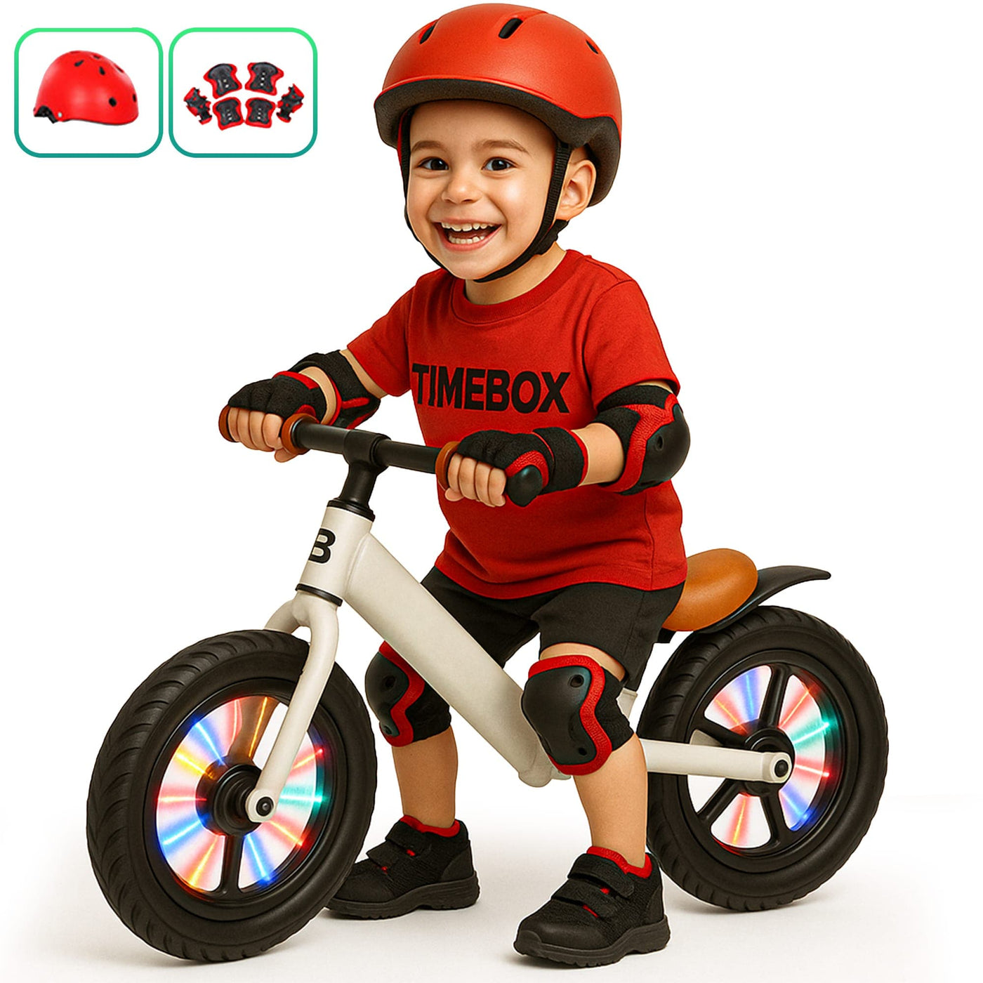 Bicicleta de echilibru Timebox, Fara pedale, Pentru copii 2-5 ani, Cadru metalic usor, LED, Sa reglabila, Instalare rapida, Ideala pentru invatarea echilibrului, Casca si Protectii pentru genunchi, Alb