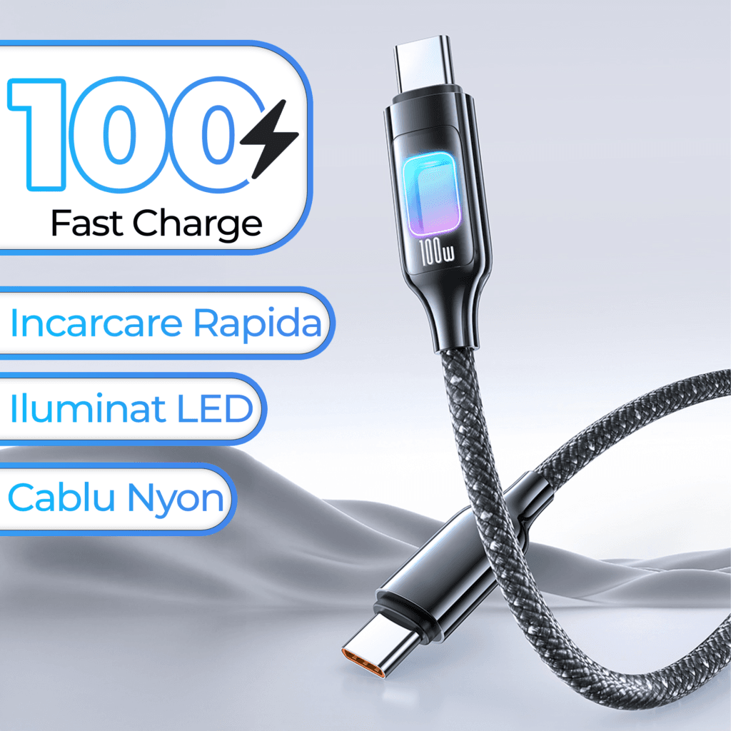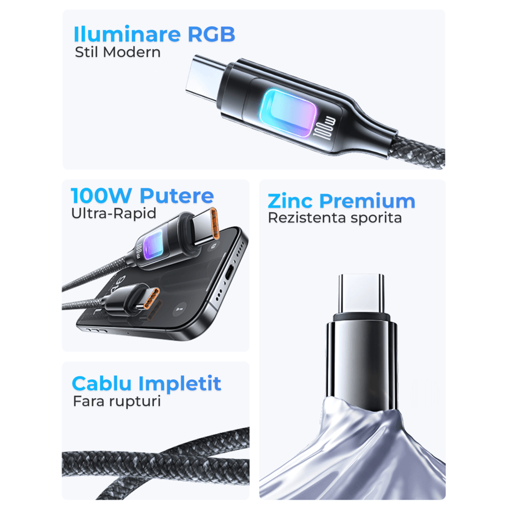 Cablu de Incarcare si Transfer de Date Timebox, Fast Charge 100W, Aliaj de Zinc, 1.2m, Nylon, USB-C la Type-C, Lumini RGB, Universal Compatibil iPhone 15, MacBook, Android, Samsung, Huawei, Xiaomi, Negru