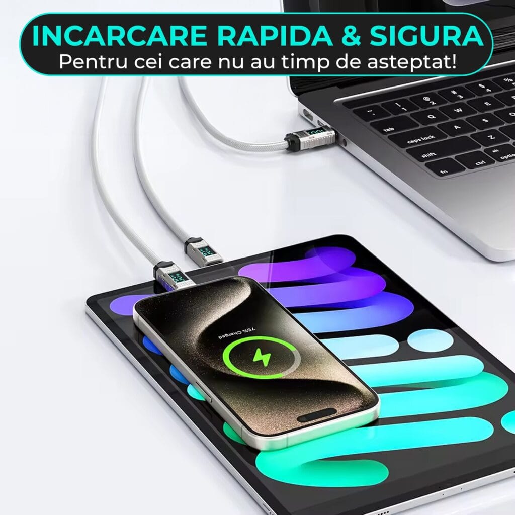 - Cablu de Încărcare și Transfer de Date: Ideal pentru încărcare rapidă și transfer de date eficient.