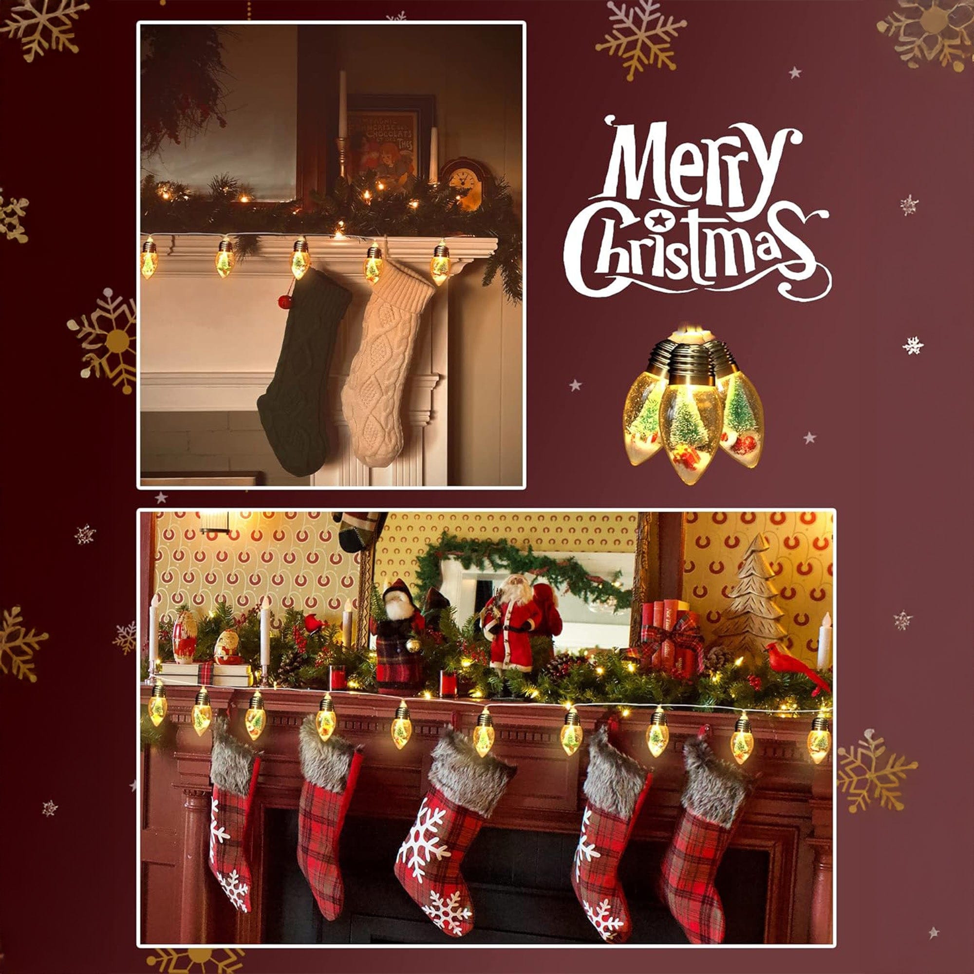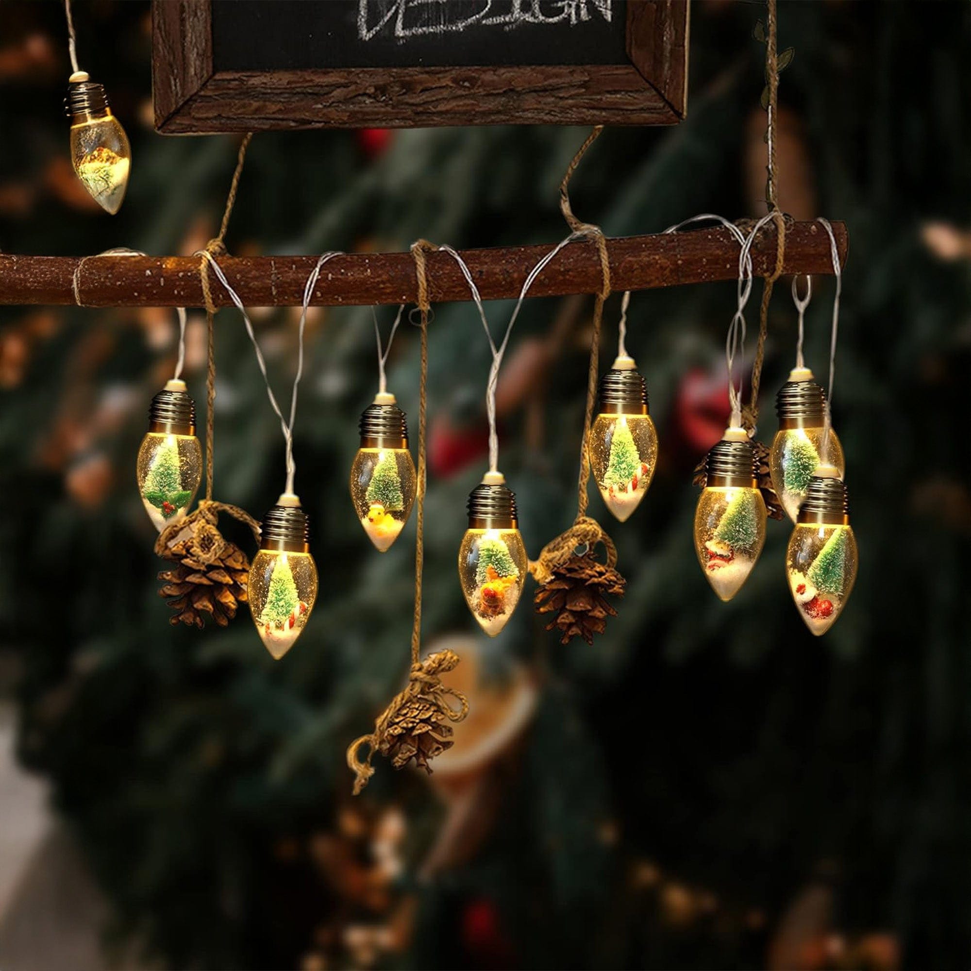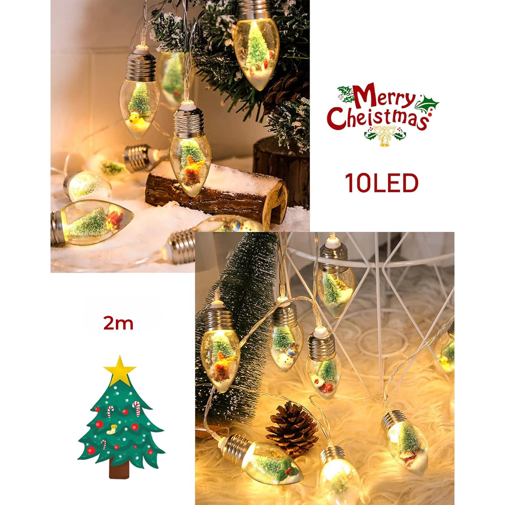 Instalatie Craciun, 2m, 10 becuri LED Snow Globe, Decor cu braduti si zapada, Acril rezistent, 2 moduri lumina, Alimentare pe baterii AA, Interior/exterior