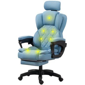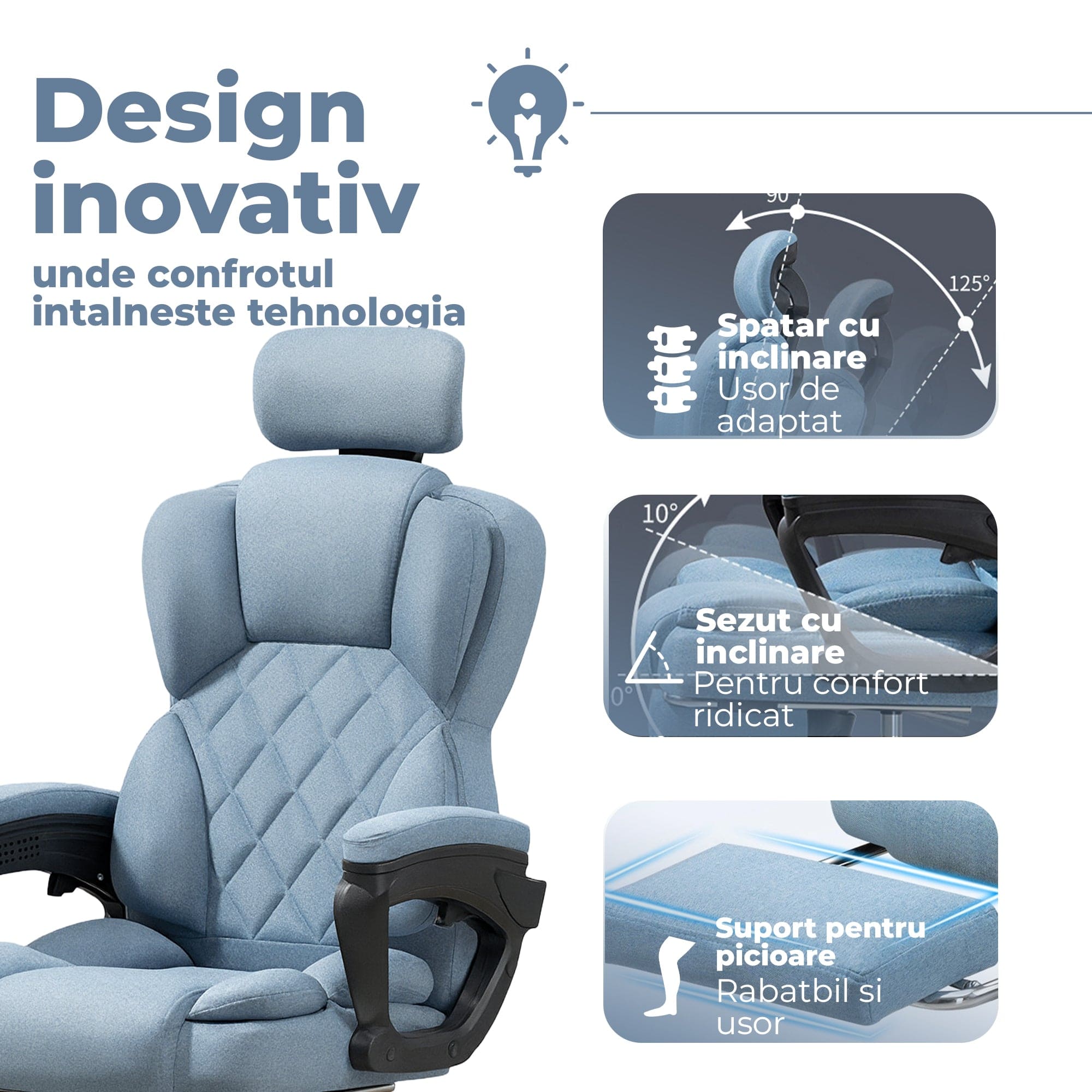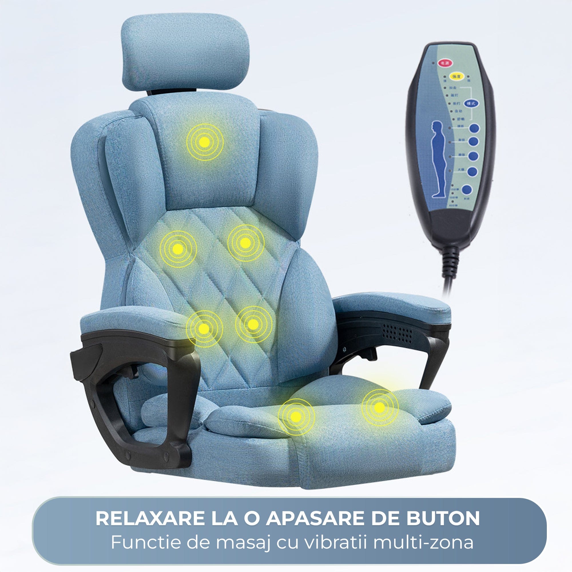 Scaun de Birou cu Masaj TimeBox – Reglabil pe Inaltime, Functie de Masaj cu Vibratii, Spatar Rabatabil 125°, Suport pentru Picioare Retractabil, Tetiera Reglabila, Rotire 360°, Captuseala Densa din Spuma, Design Ergonomic, Turcoaz