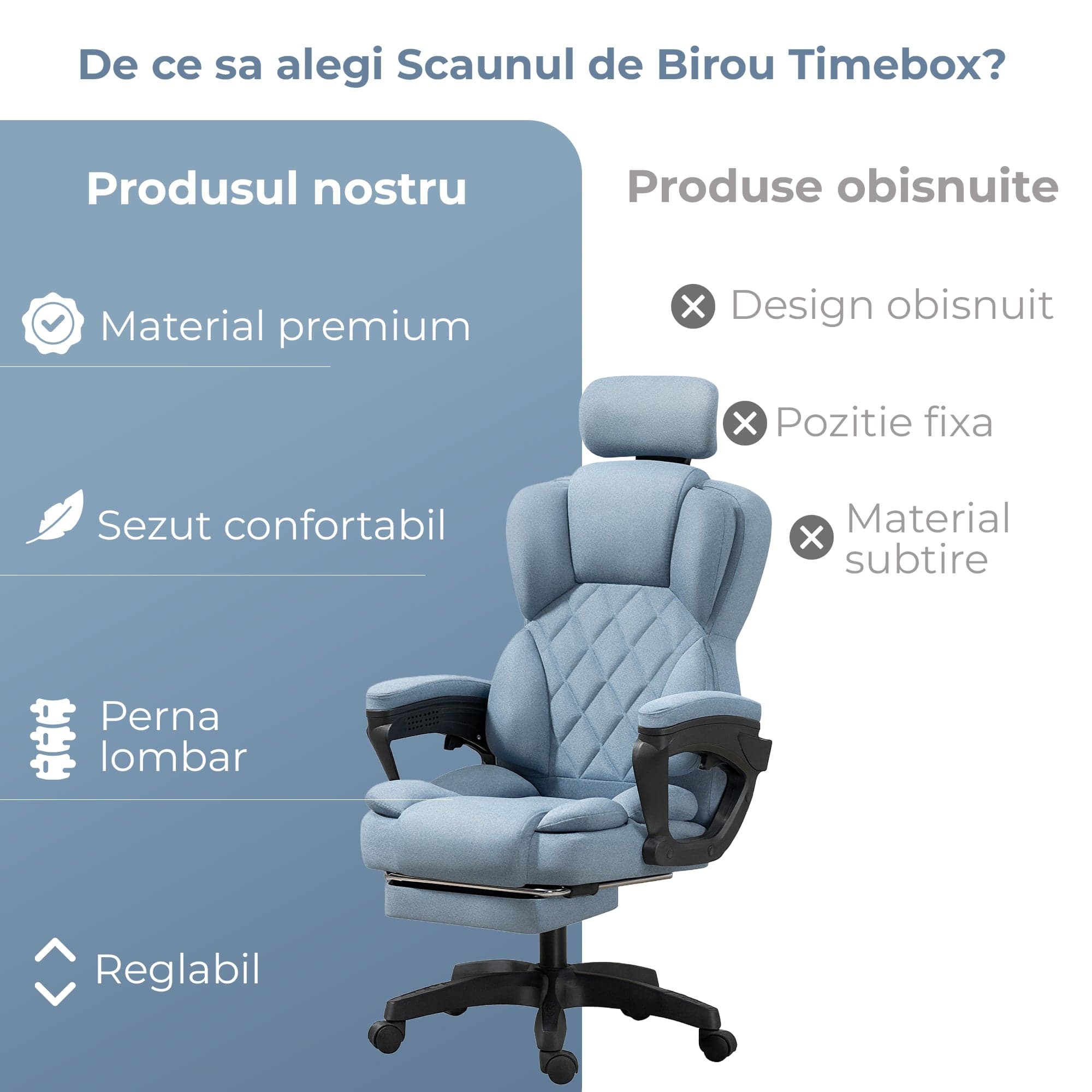 Scaunul birou cu masaj Timebox reduce tensiunea prin vibratii, iar spatarul 125°, suportul de picioare si tetiera reglabila imbunatatesc pauzele; rotirea 360° si captuseala densa sustin confortul in sesiuni lungi la birou.