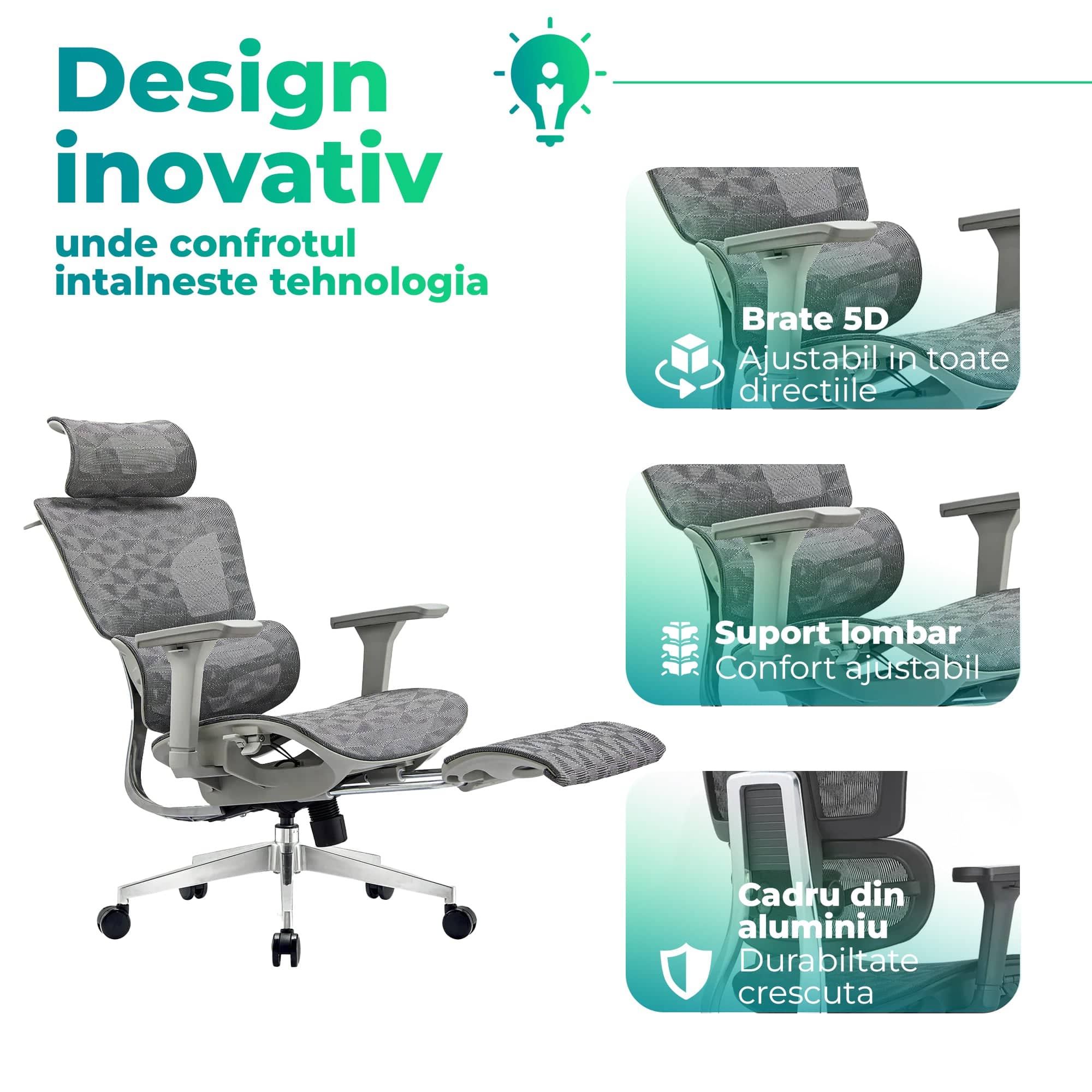 - Reglare Înălțime Spătar: 6 poziții, până la 150°, pentru personalizarea confortului.