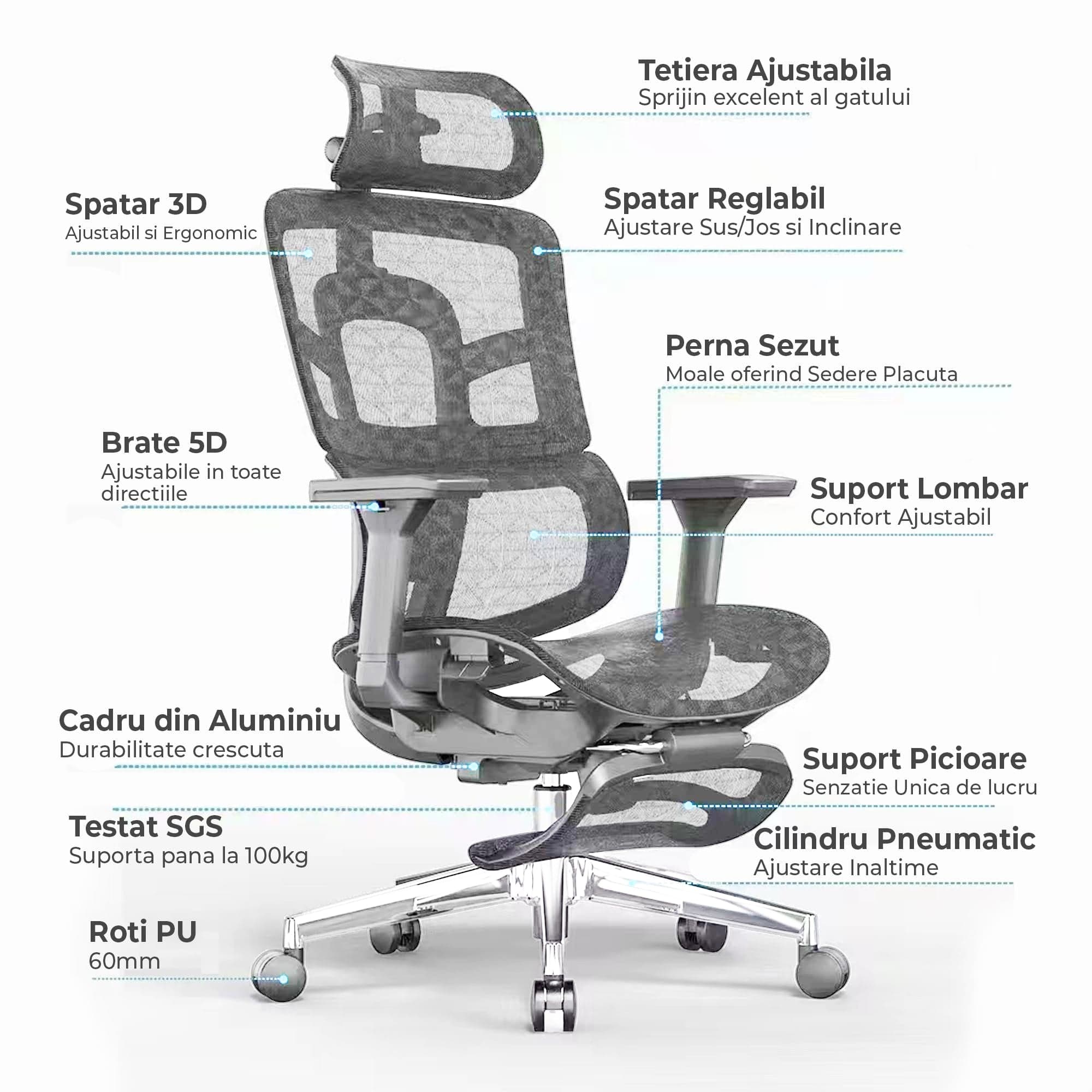 - Material Plasă Mesh: Asigură ventilare și confort sporit.