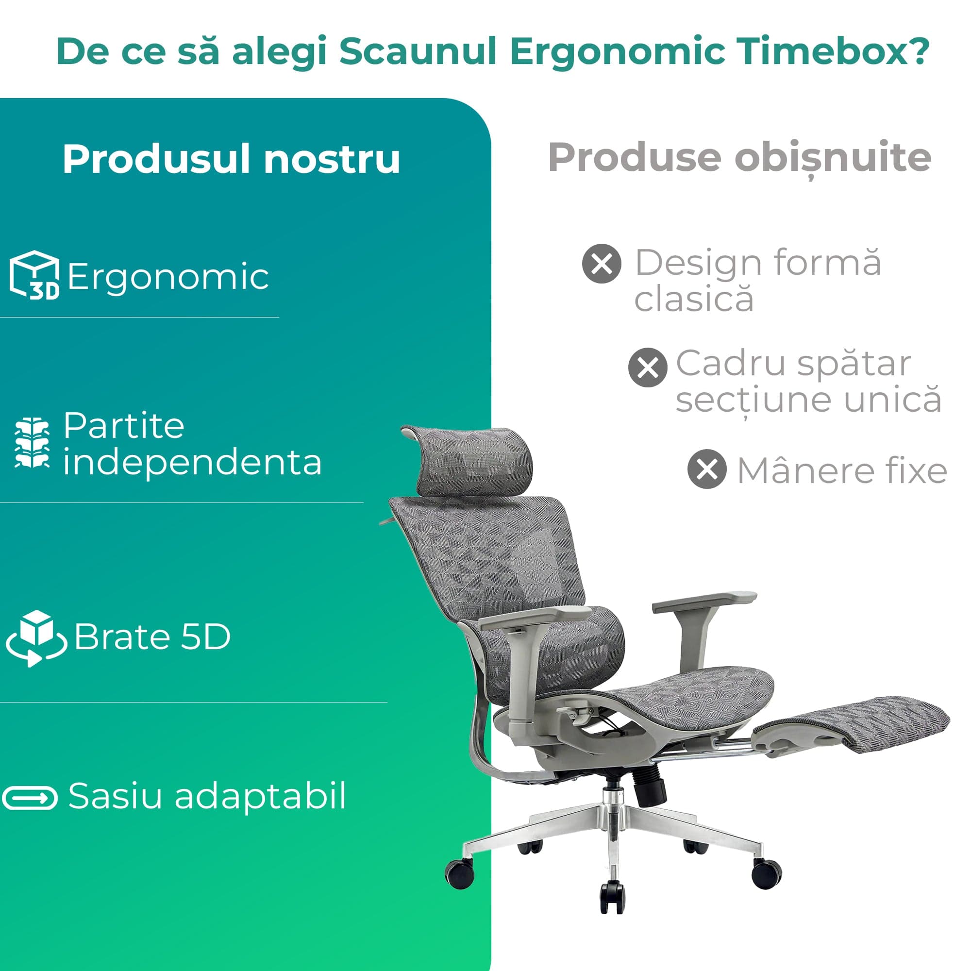 | Beneficiu | Scaunul ergonomic Timebox | Scaun obișnuit |