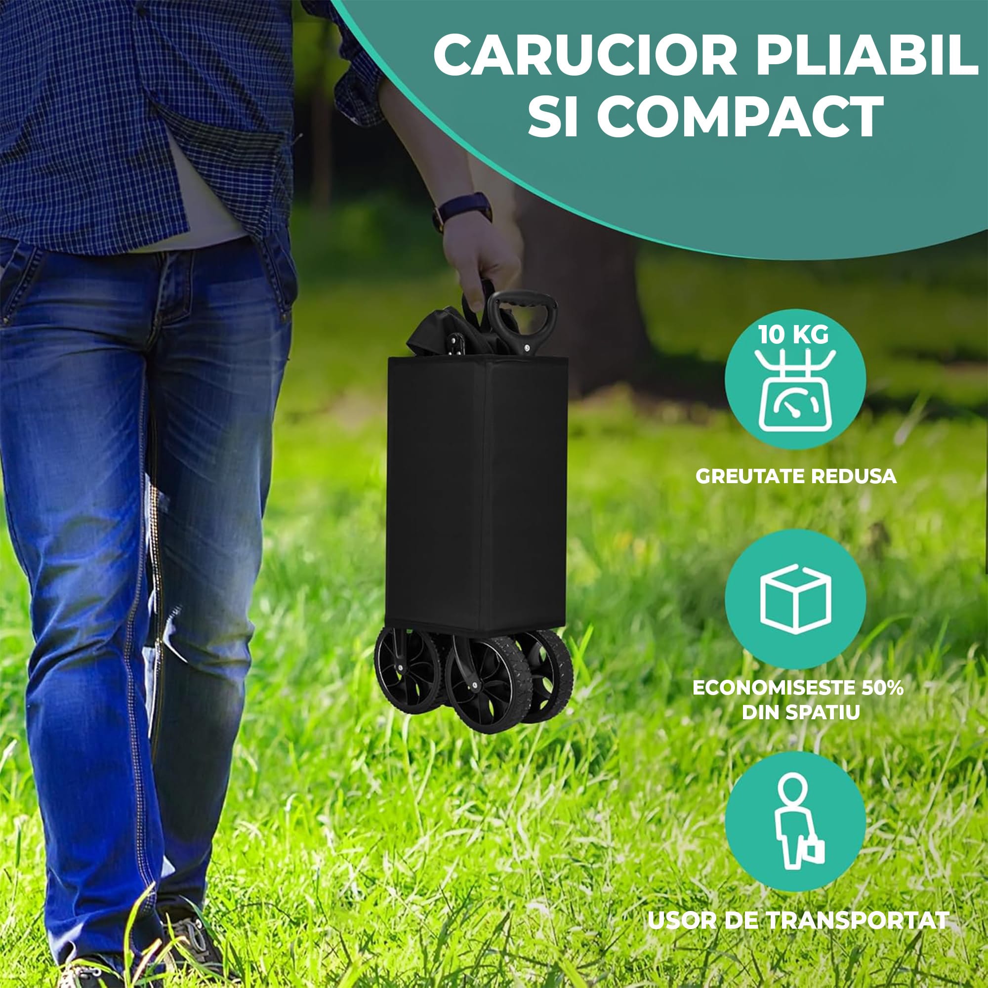 Carucior Pliabil de Transport cu Roti Detasabile – Cadru din Otel, Capacitate Mare 115 kg, Tesatura Rezistenta, Ideal pentru Camping, Plaja, Gradina si Cumparaturi