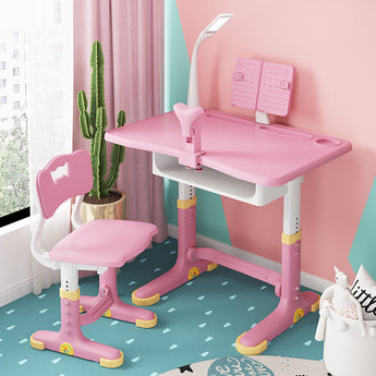 Set Birou Copii + Scaun, Reglabil 6-18 ani, Blat 70x45 cm, Inclinare ergonomica, Suport carte, Lampa LED, Sertar, Colturi rotunjite, Roz