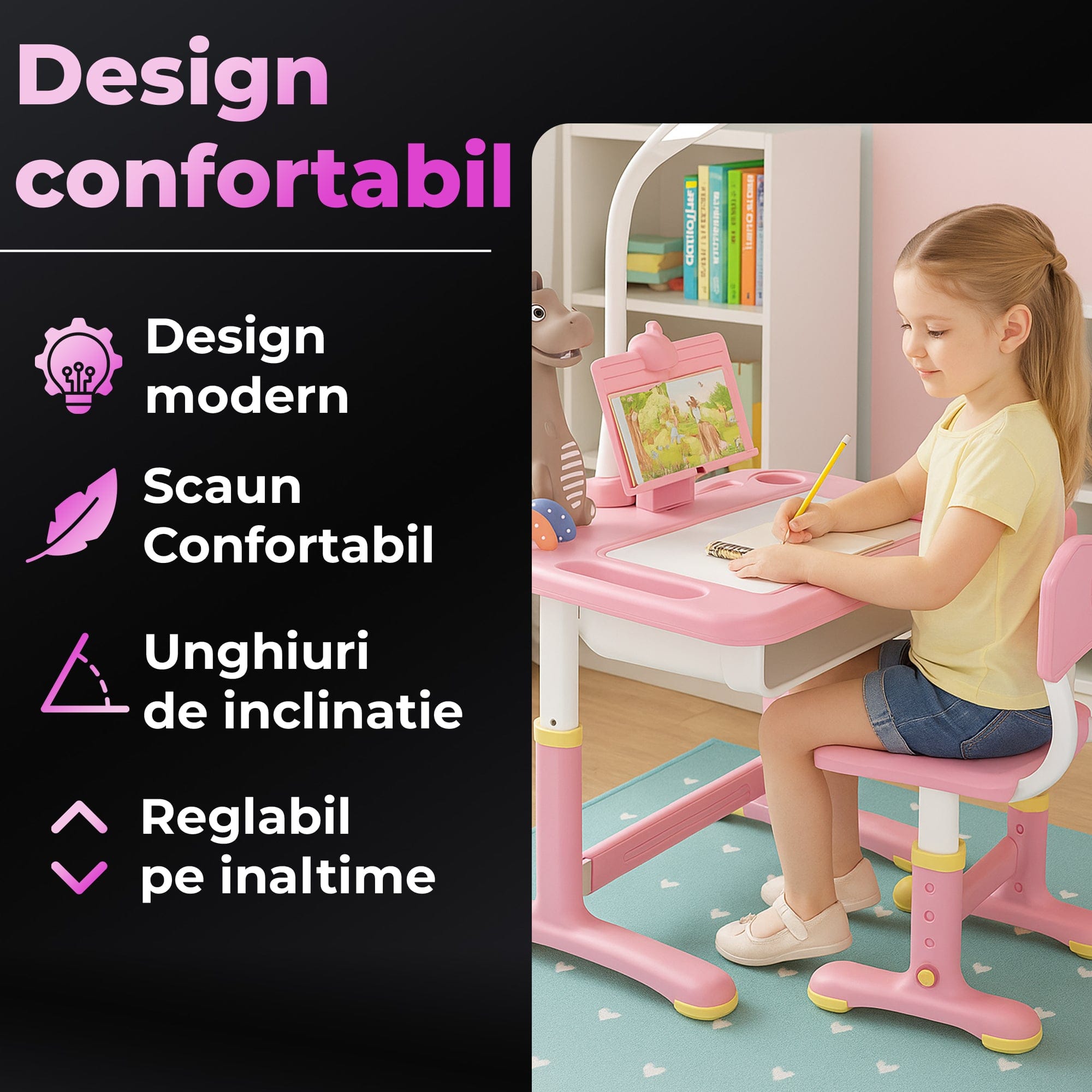 ⚡ Set Birou Copii Reglabil 70x45 cu Lampa LED Roz ⚡
