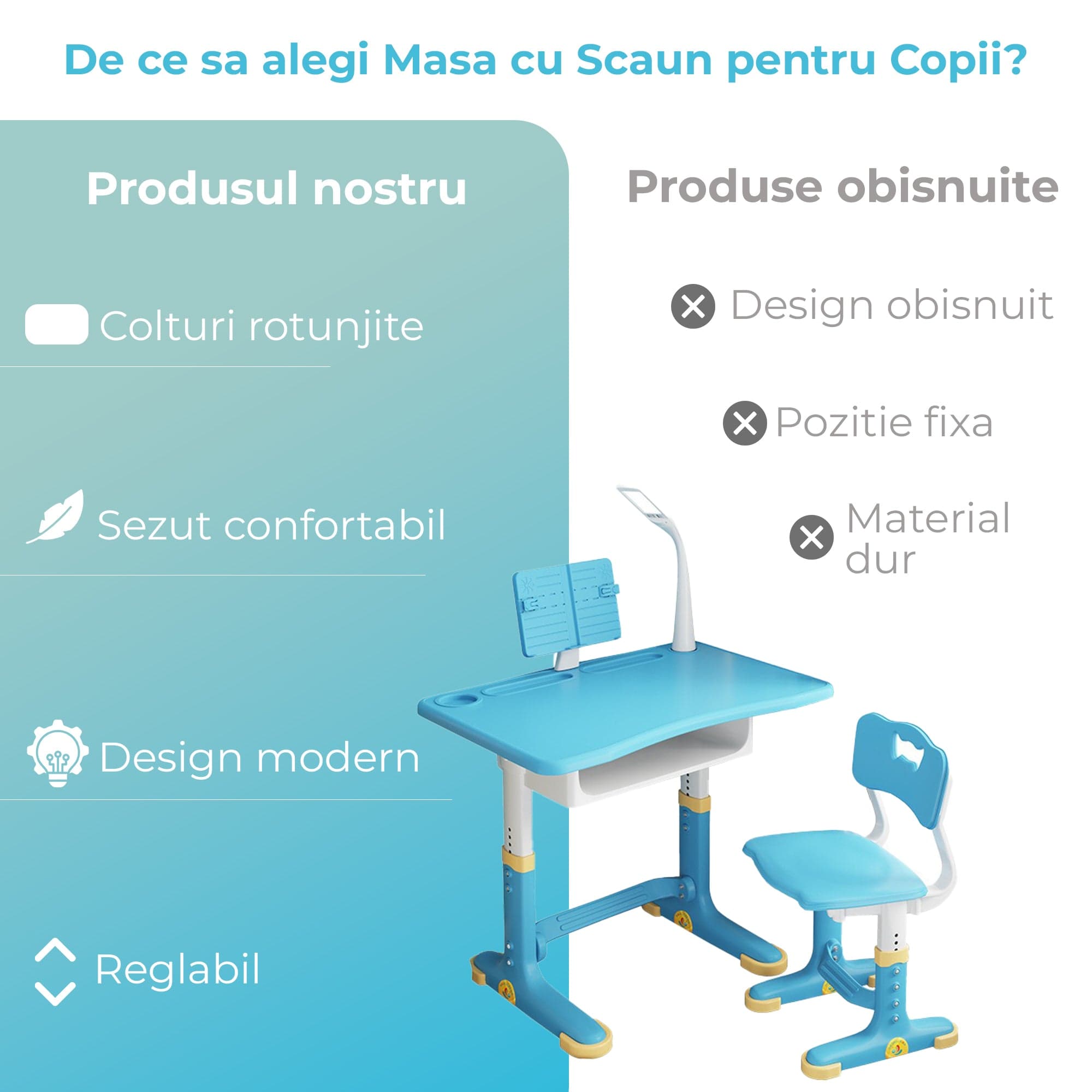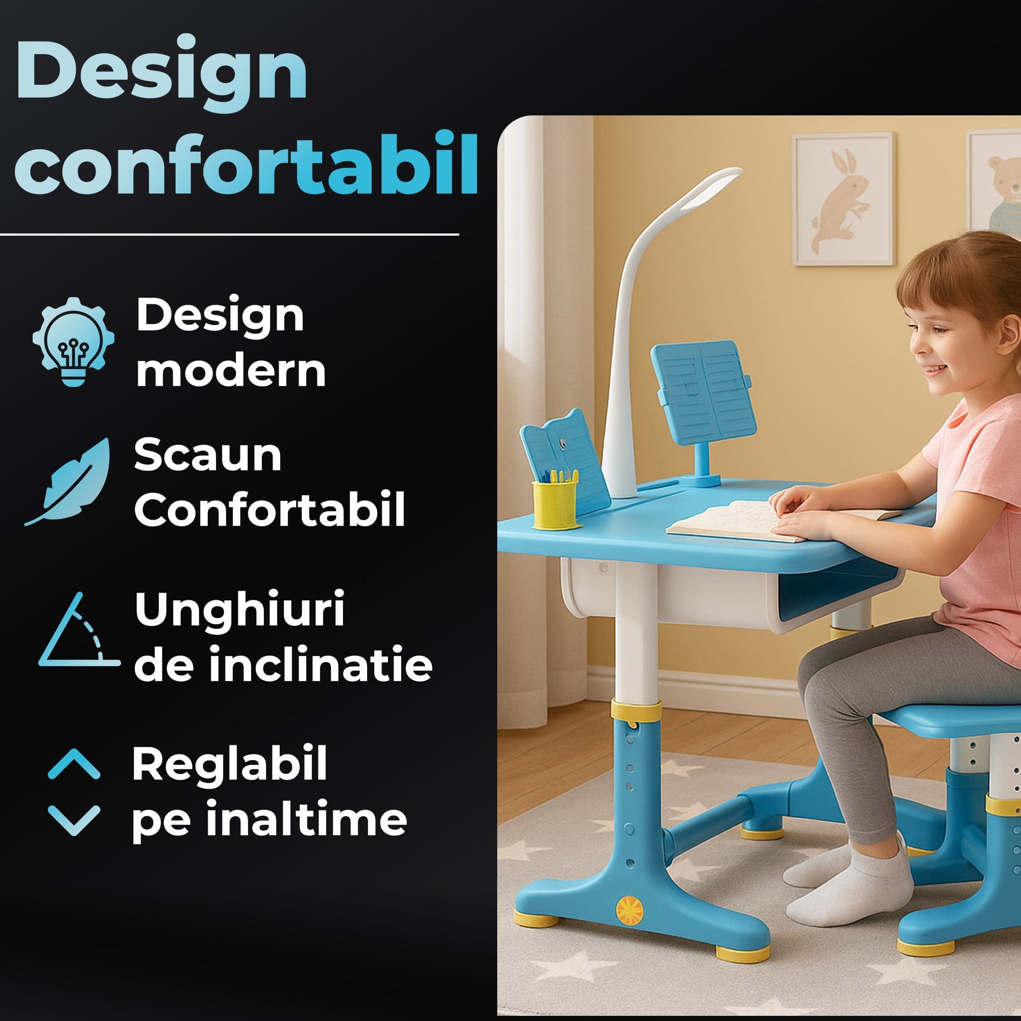 • set birou si scaun copii adaptat: reglaj pe inaltime (birou pana la ~70 cm), design ergonomic, lampa LED, materiale ABS+PP, accesorii multifunctionale pentru 3–12 ani, albastru.