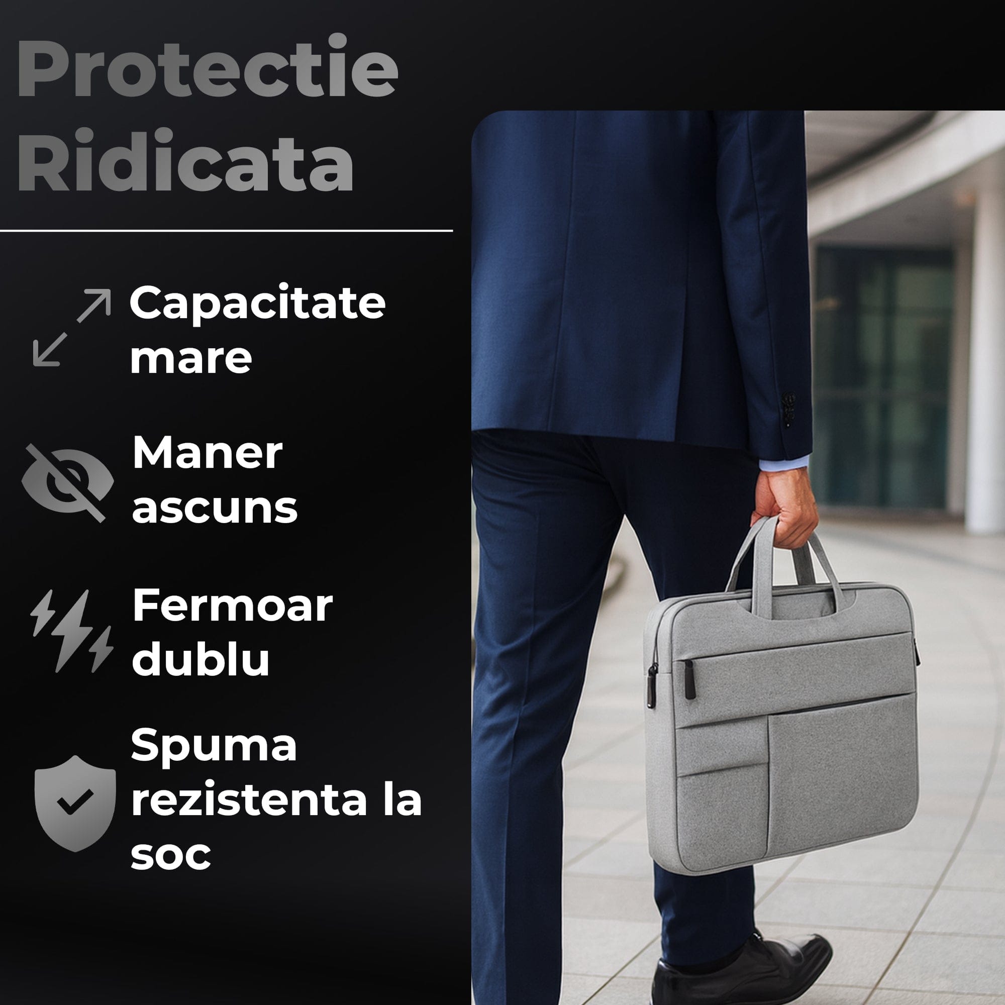 Geanta Laptop portabila Timebox, 13'', 14'', 15'', 16'' inch, pentru Notebook, Ultrabook, captusit interior cu microfibra, 3 buzunare exterioare, impermeabila, compatibila MacBook Pro, Air, Gri