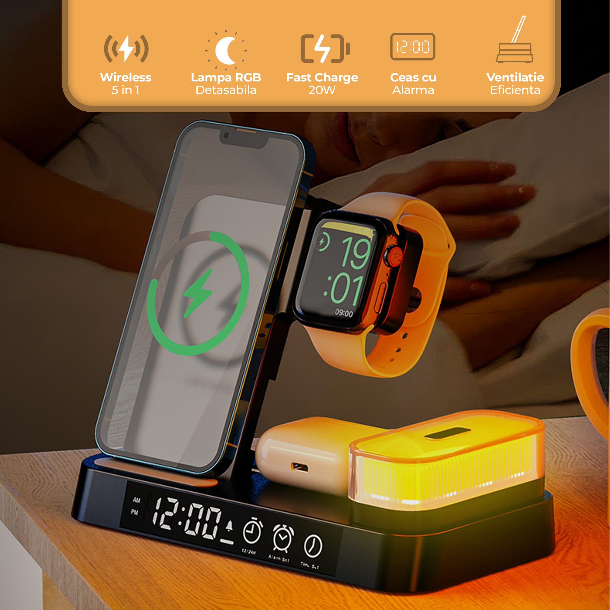 Incarcator Wireless 5 in 1, multifunctional, Fast Charge 20W, lampa de noapte detasabila, ceas cu alarma, Compatibil iPhone, Samsung, Airpods, Huawei, Apple Watch, Galaxy Buds