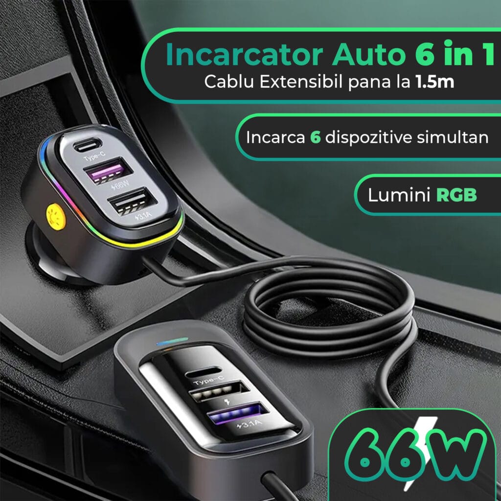 Incarcator auto 66W Super Fast Charge, Timebox, 6 in 1, USB-C, USB, Lumini LED, Universal, Negru