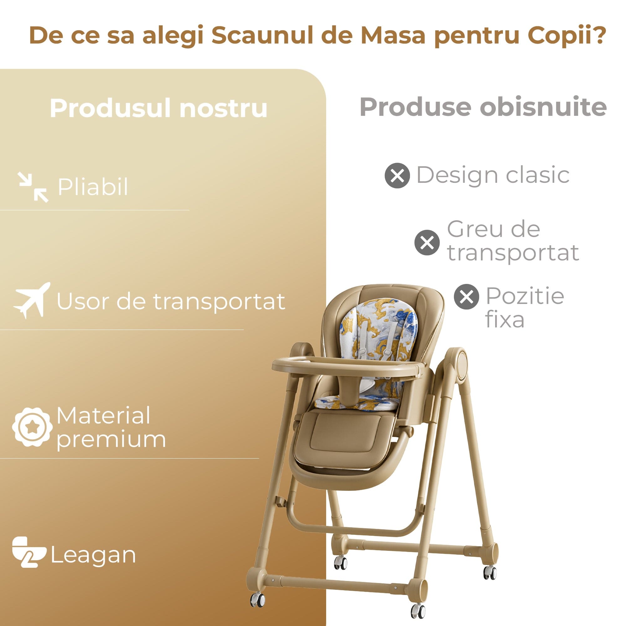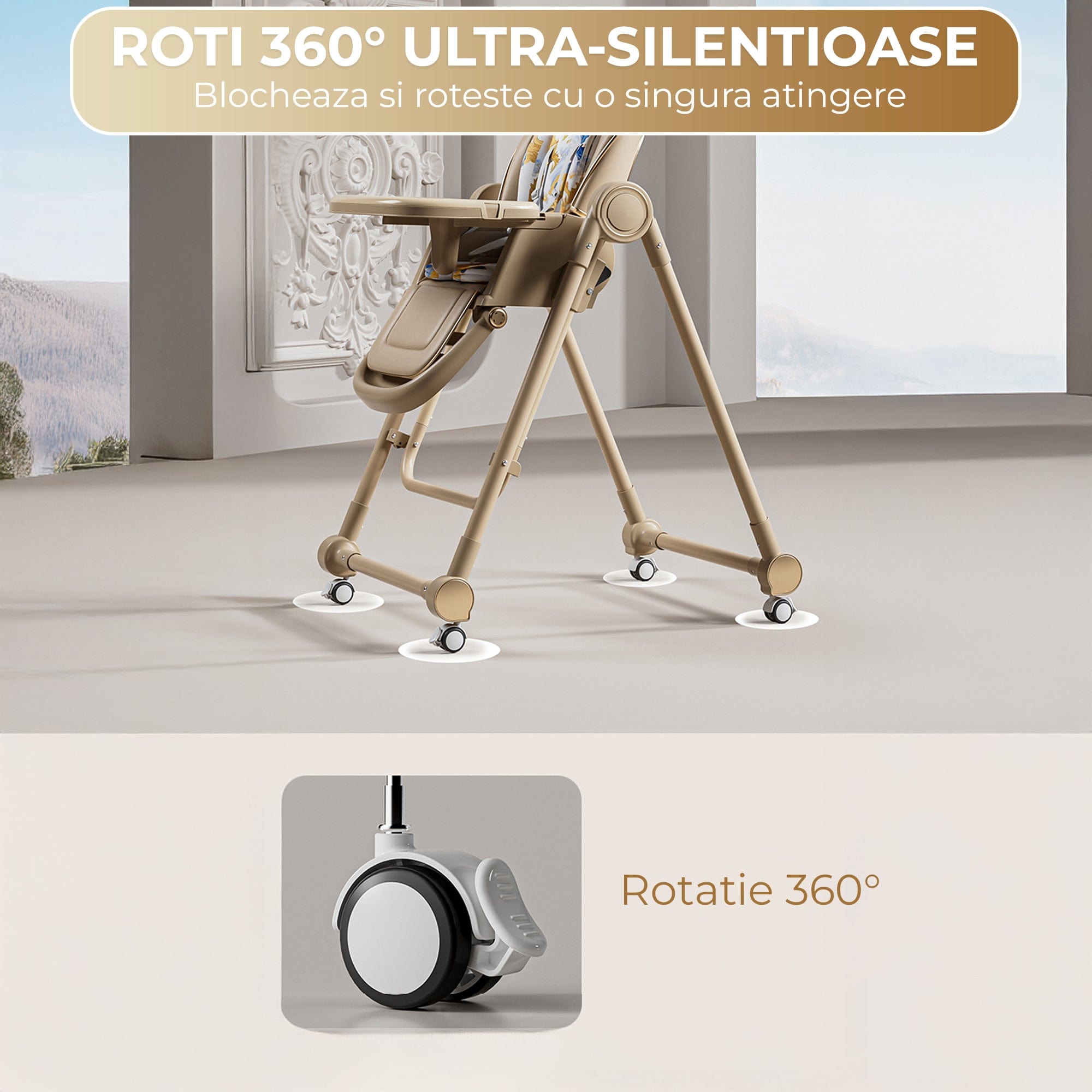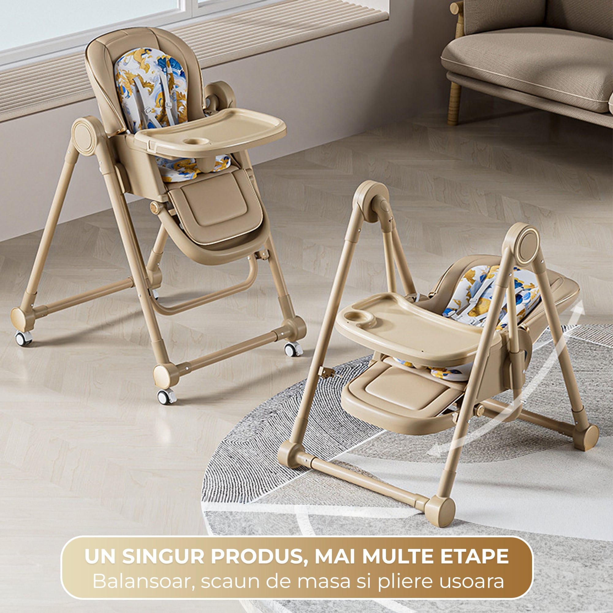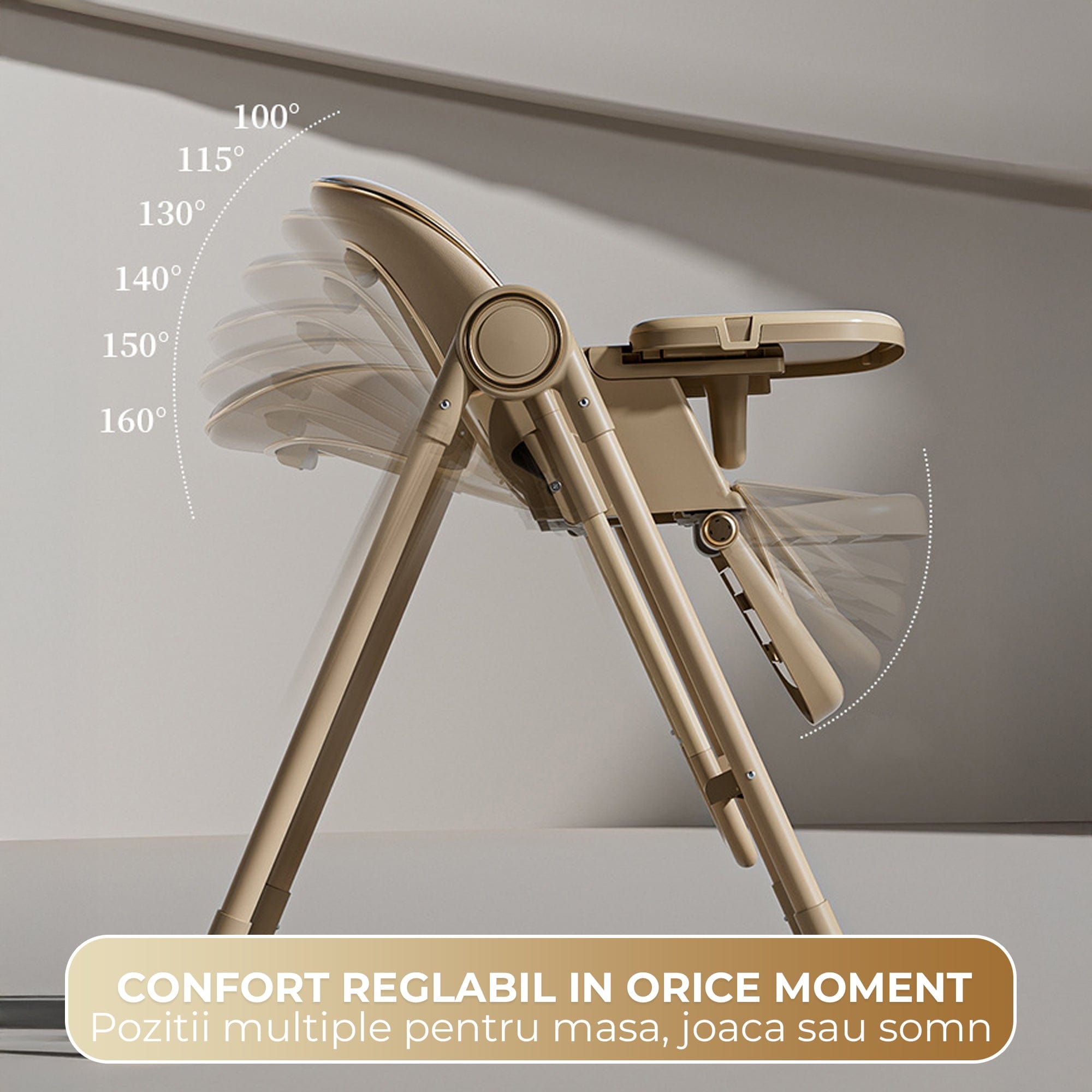 Scaun de masa pentru copii, Pliabil si usor de transportat, Reglaj 8 trepte, Spatar 100–160° + Modul leagan, Centura in 5 puncte, Husa lavabila, Roti 360° cu frana, Bej