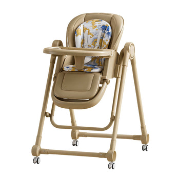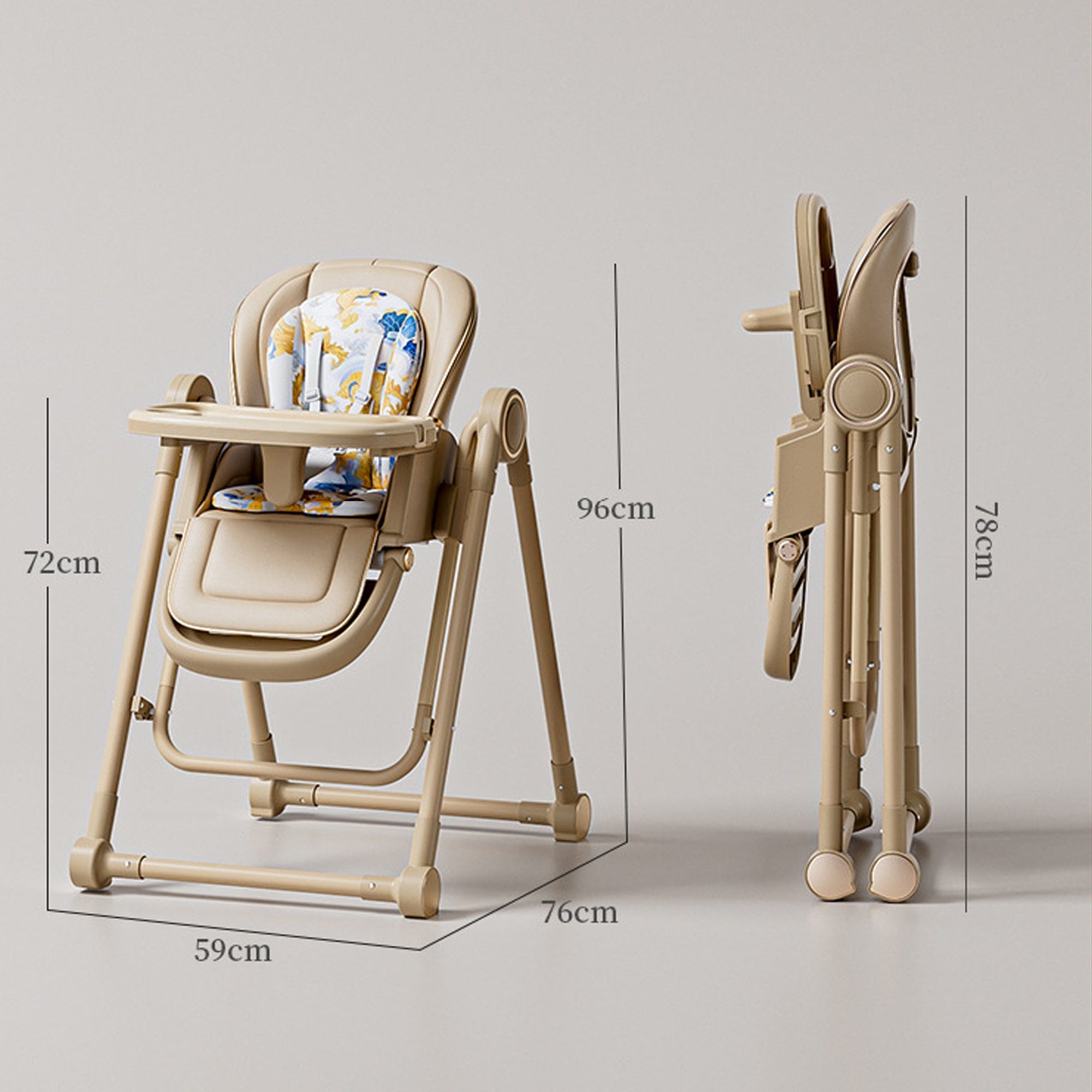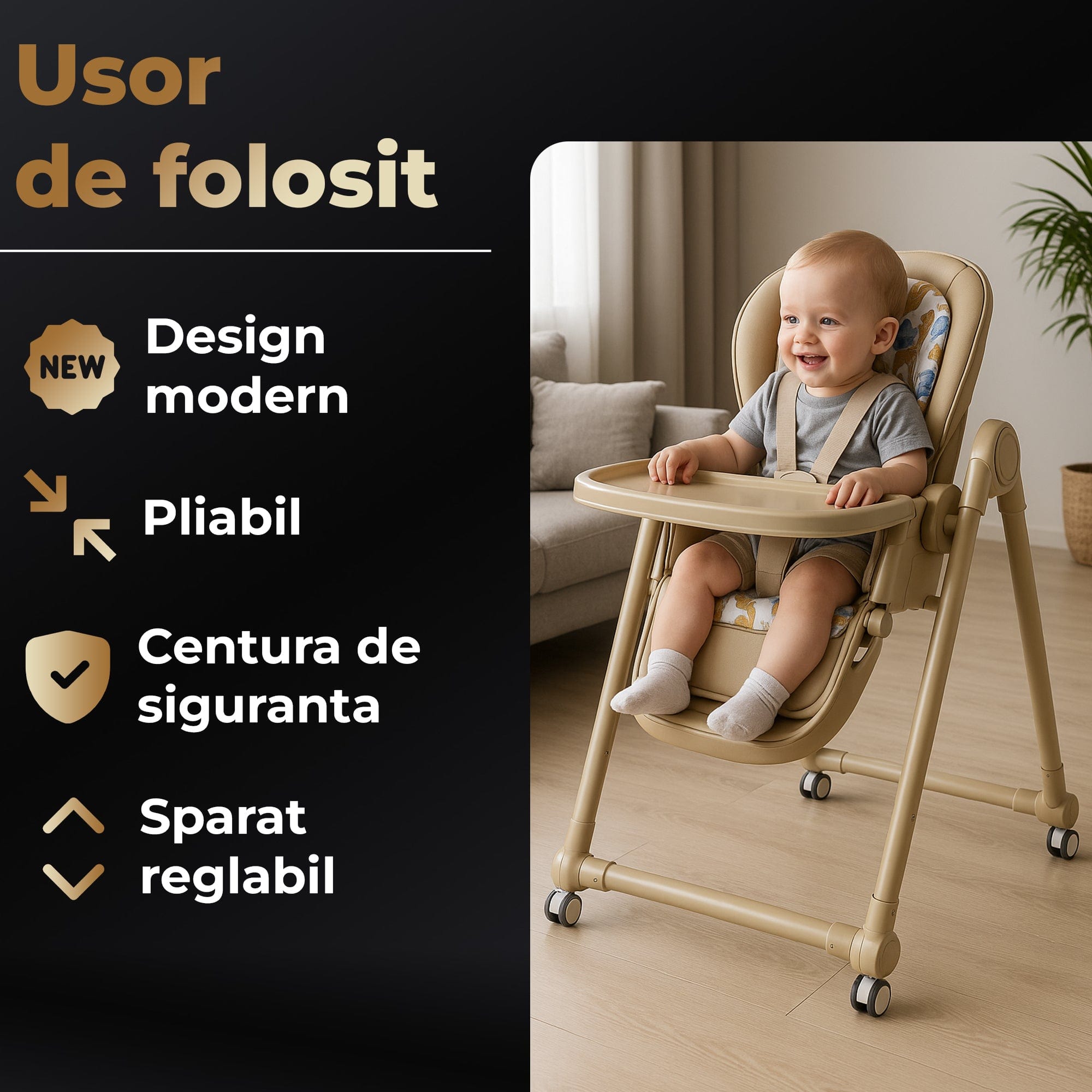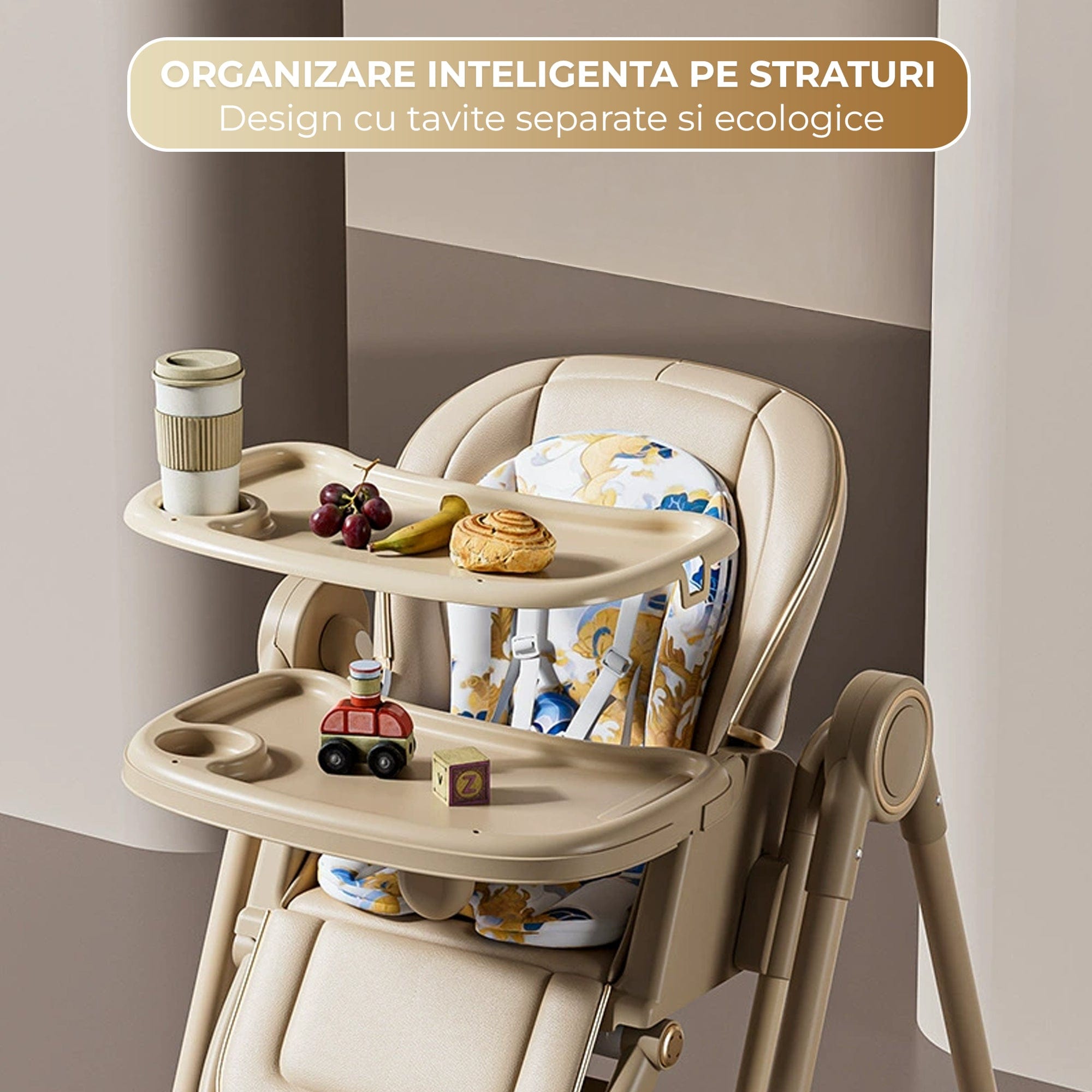 Scaun de masa pentru copii, Pliabil si usor de transportat, Reglaj 8 trepte, Spatar 100–160° + Modul leagan, Centura in 5 puncte, Husa lavabila, Roti 360° cu frana, Bej