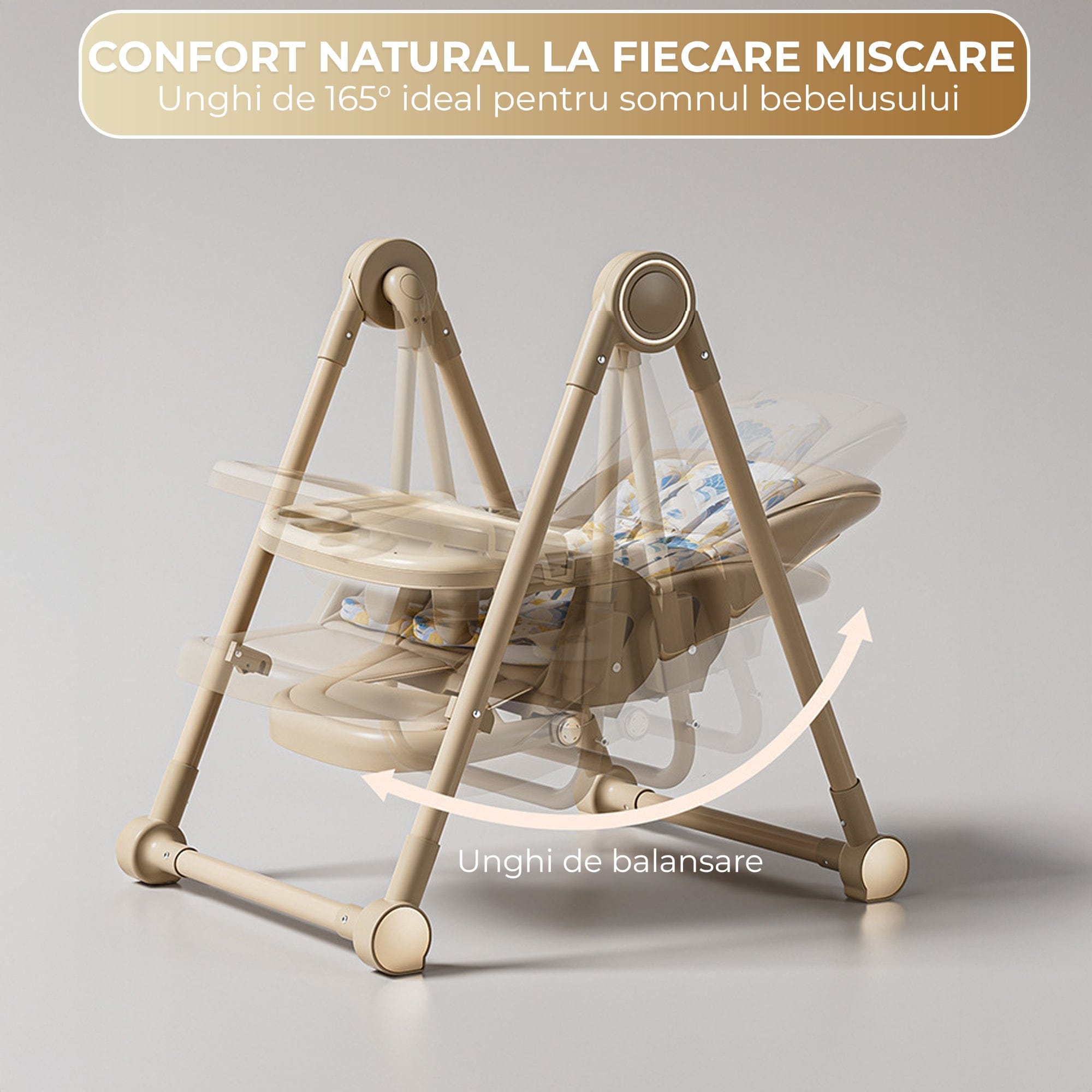 - Confort de la masa la somnic: reglaje variate, apoi spatar 100–160 si modul leagan pentru tranzitii line.