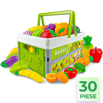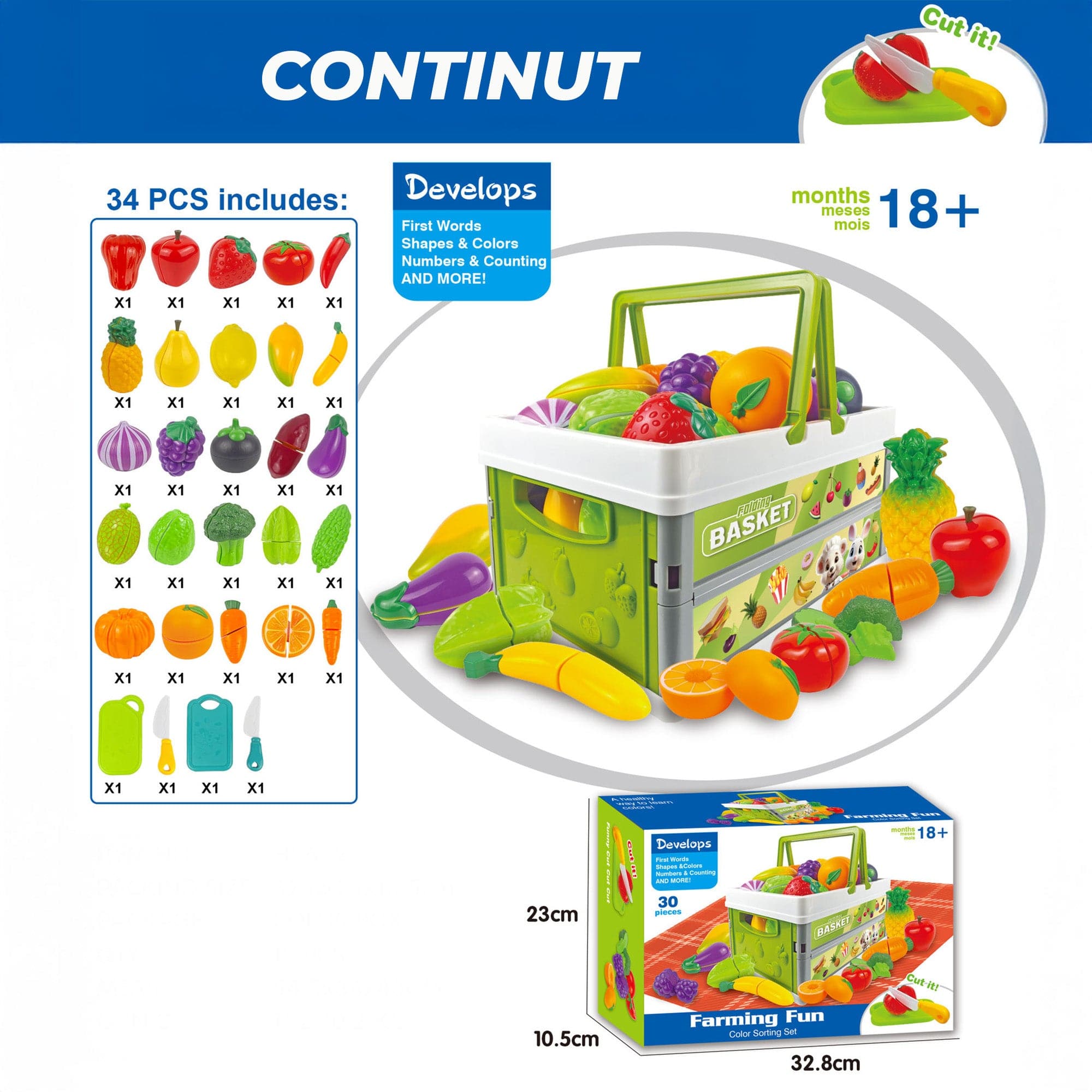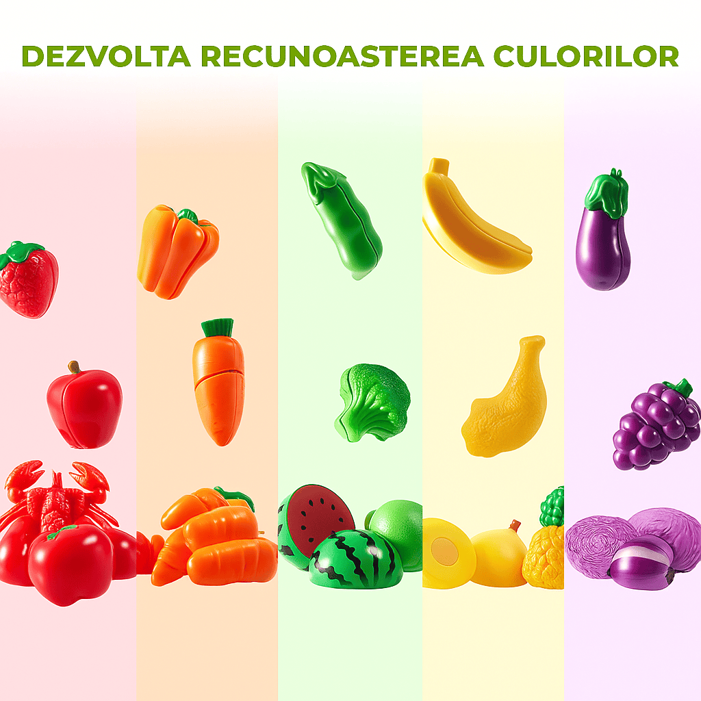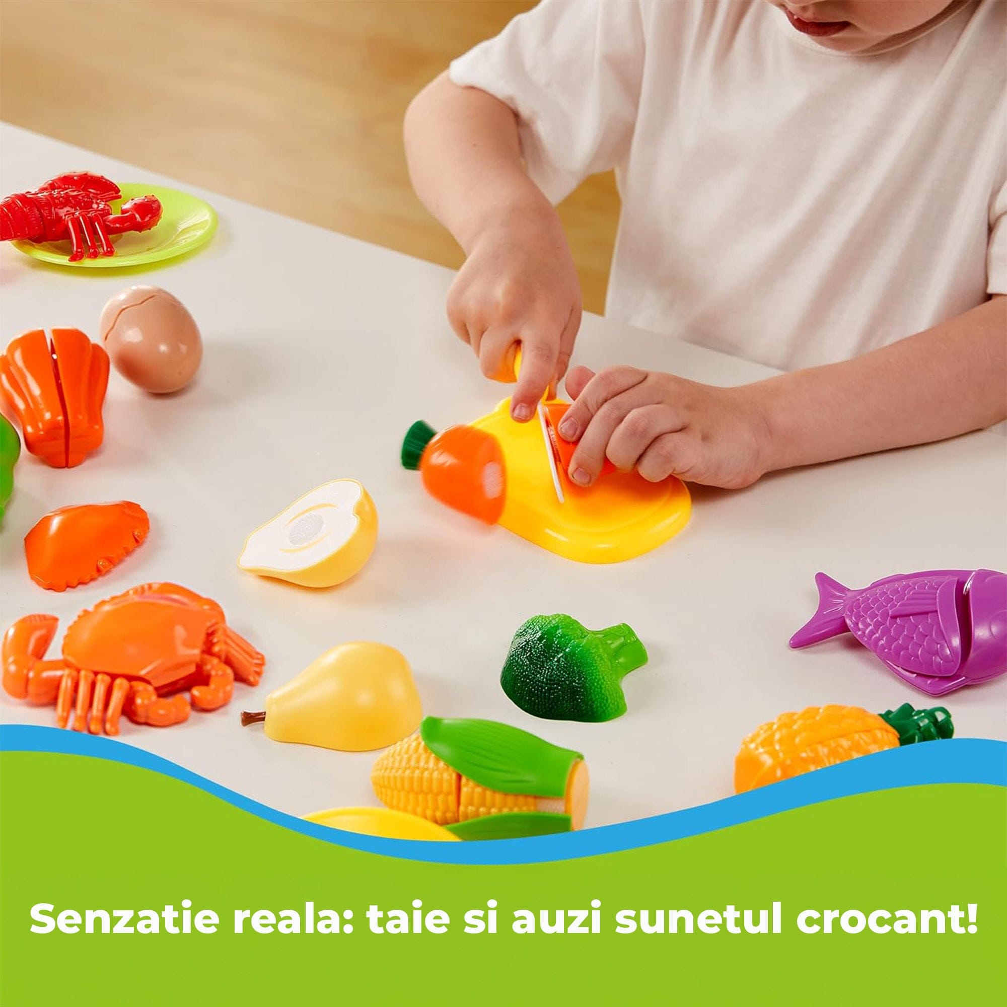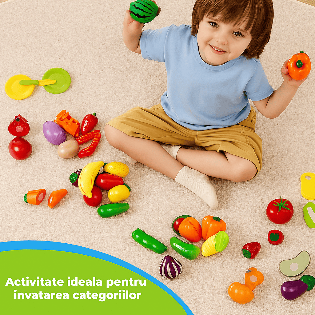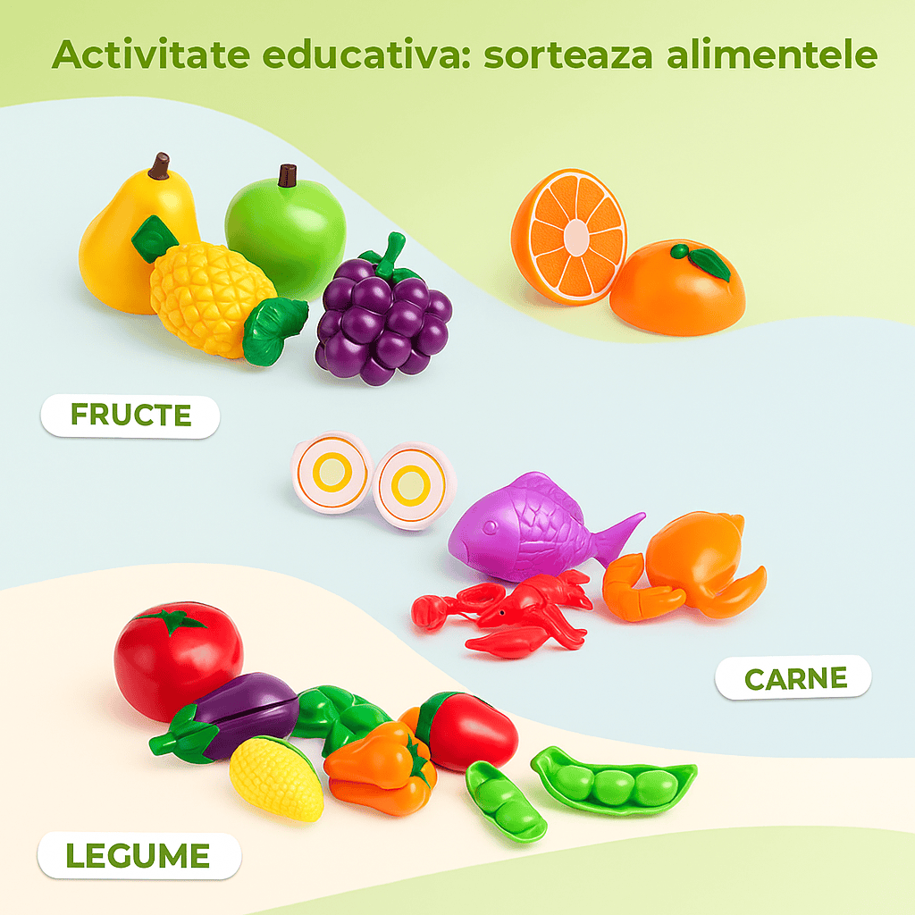 - Set educativ diversificat – contine multiple alimente de jucarie precum fructe, legume si carne, special concepute pentru copii mici