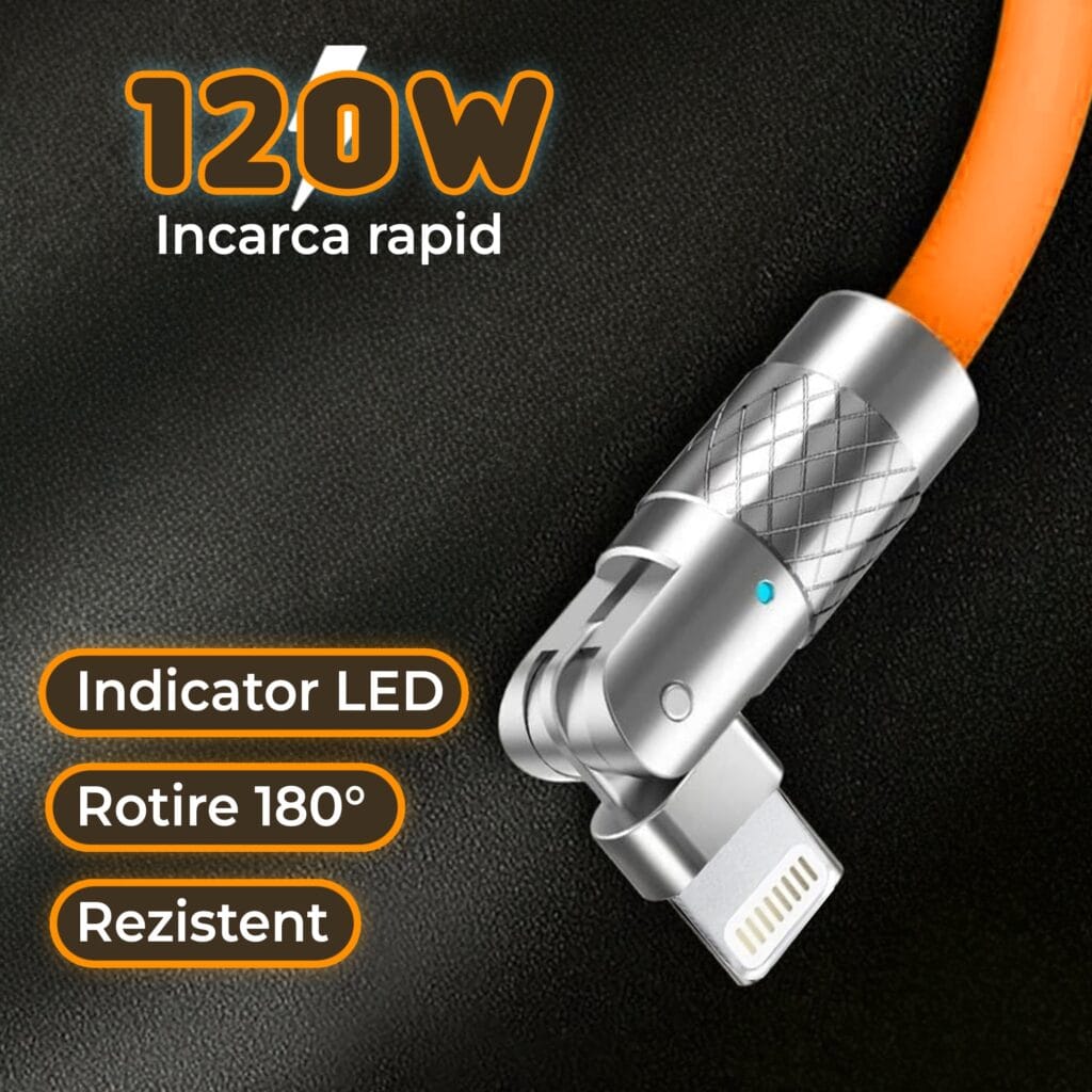 Cablu Date si Incarcare Rapida Timebox, 120W, Rotire 180 grade, QC 3,0, USB, Lightning Apple, 2m, Indicator LED, Portocaliu