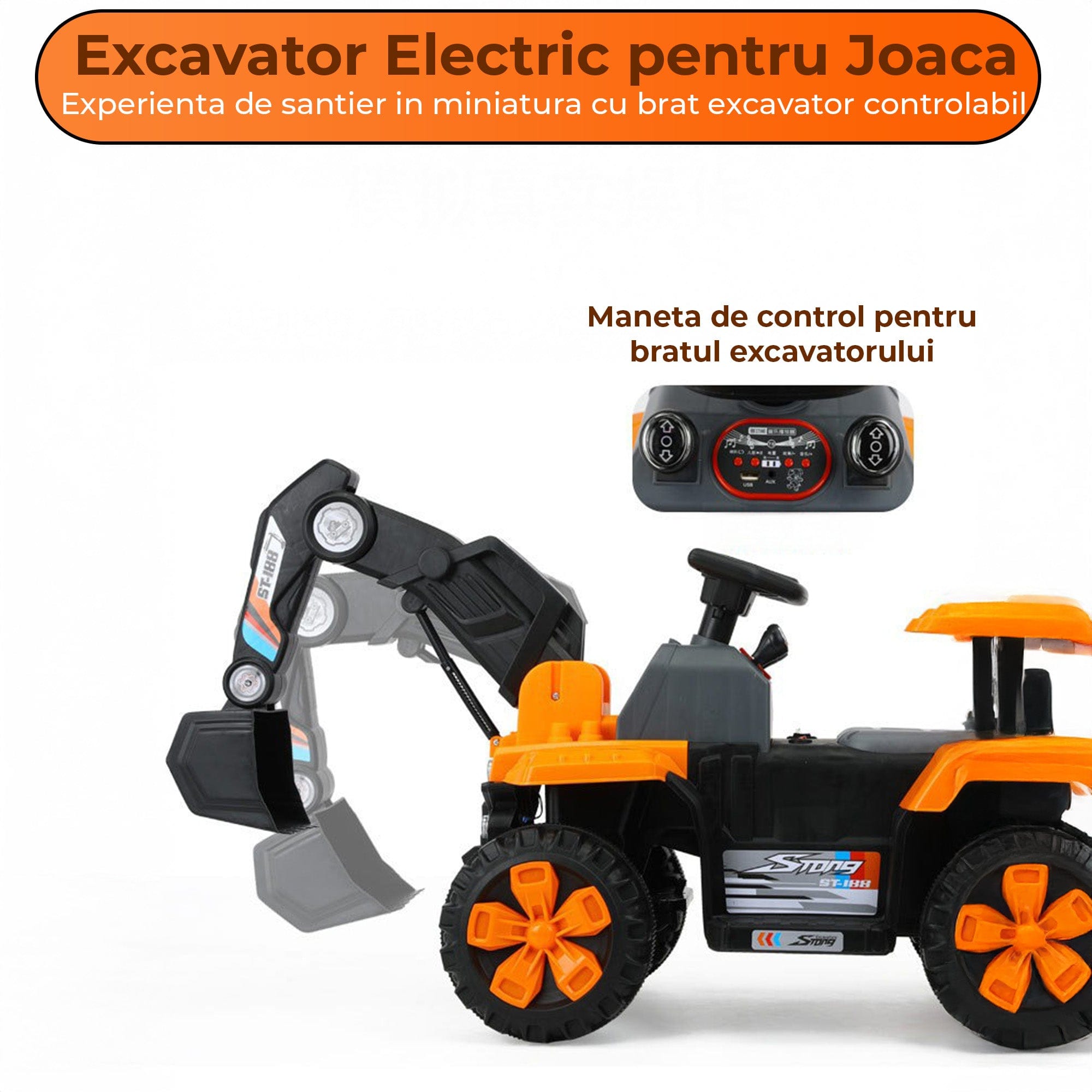 Excavator electric copii, 4 roti off-road, Brat excavare functional, Telecomanda parentala, Tractiune dubla, Incarcare USB, Lumini + Muzica, Portocaliu, 1-6 ani