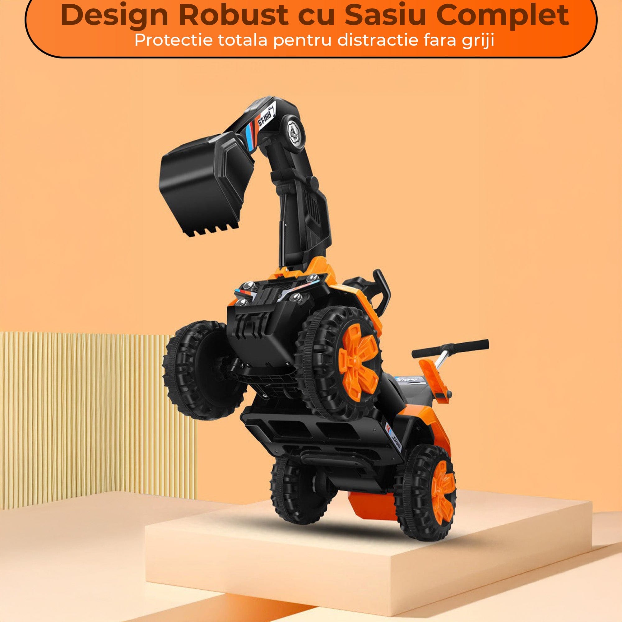 • excavator electric adaptat pentru joaca off-road, cu brat functional, telecomanda parentala, tractiune dubla si lumini.