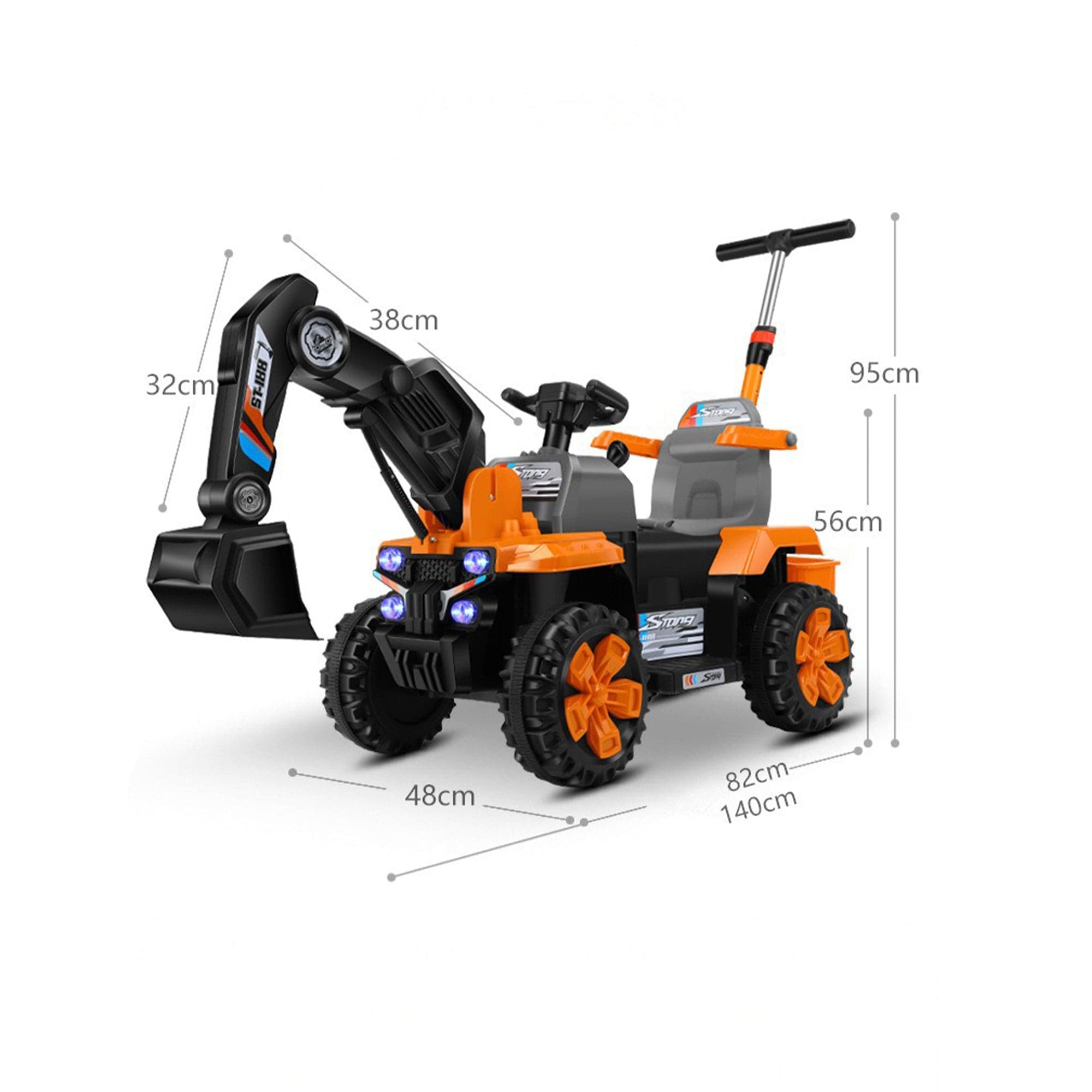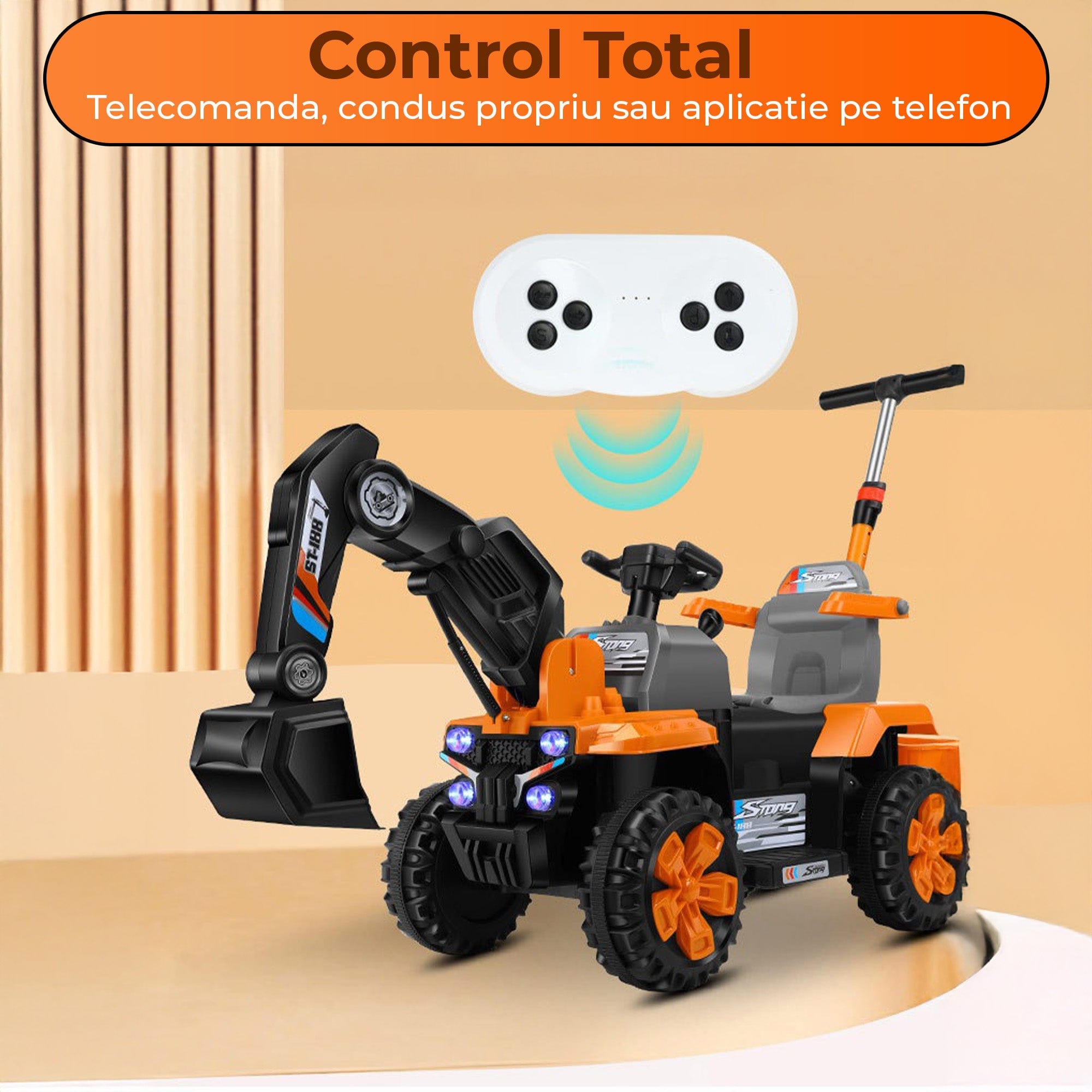 Excavatorul electric pentru copii combina telecomanda parentala cu brat functional si tractiune dubla pentru plimbari sigure si captivante. Luminile, muzica si incarcarea USB fac utilizarea usoara zi de zi, iar configuratia off-road mentine distractia pe alei, in curte sau in parc.