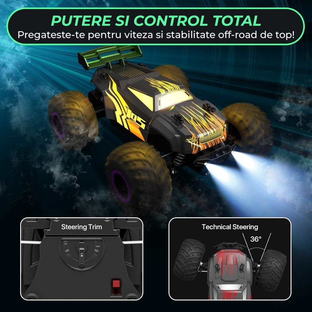 - Ce primești:Mașină cu telecomandă RC Off-Road Monster Truck + Ghid Utilizare + Garanție 24 luni și suportul nostru tehnic prietenos pregătit să rezolve orice problemă.