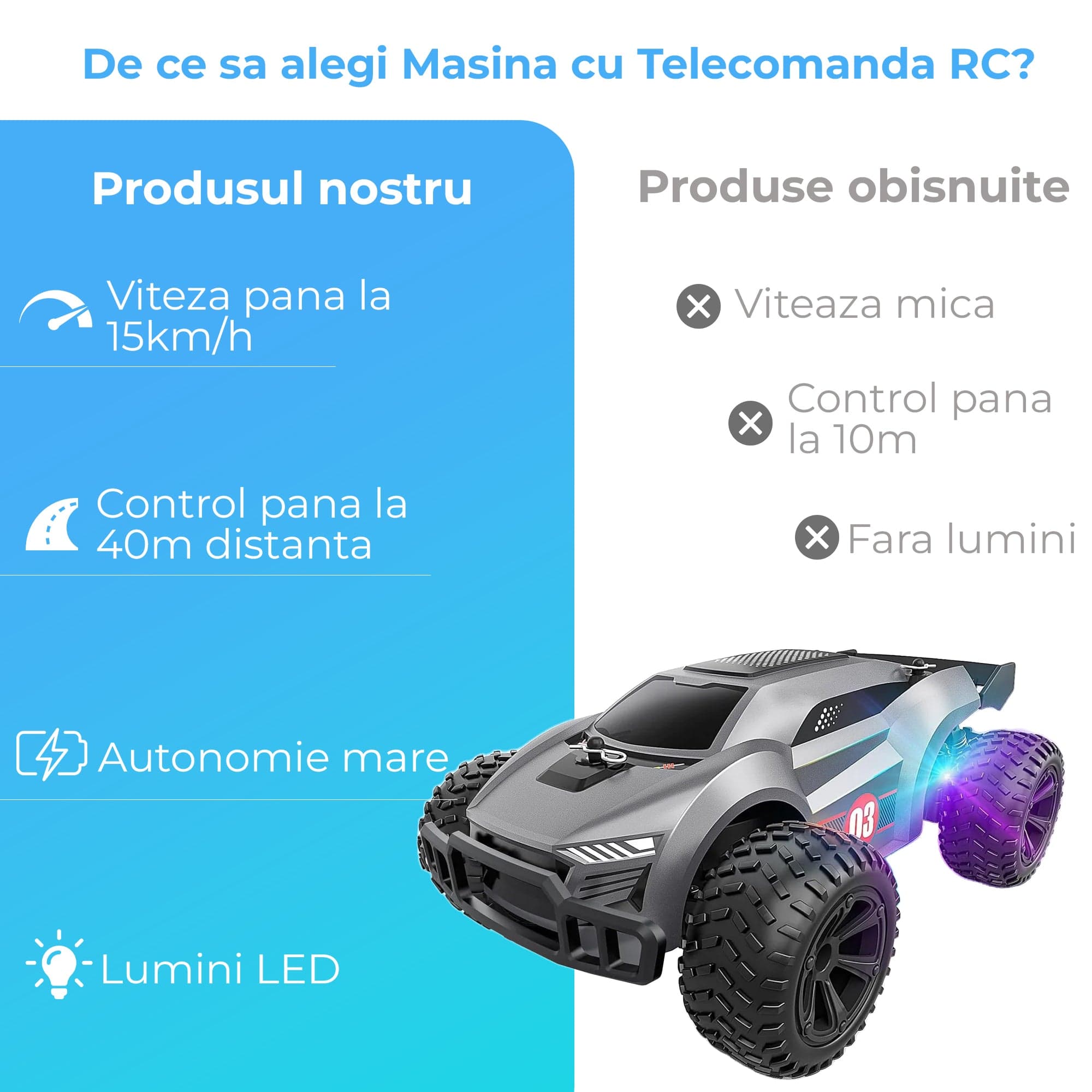 Control Precis cu Telecomandă: Telecomanda ergonomică oferă control precis și receptiv, permițându-ți să faci viraje rapide și să controlezi accelerația fără efort.