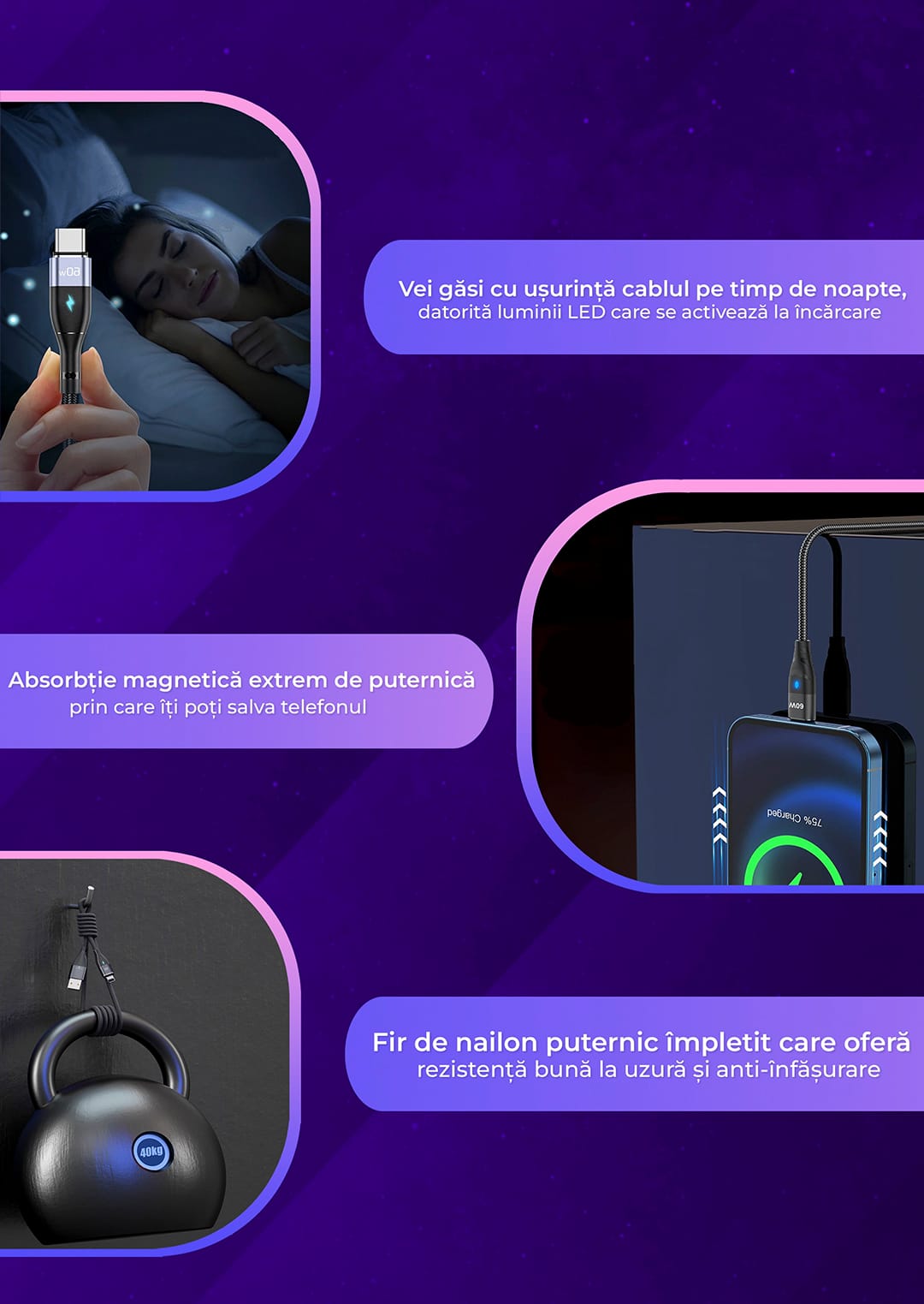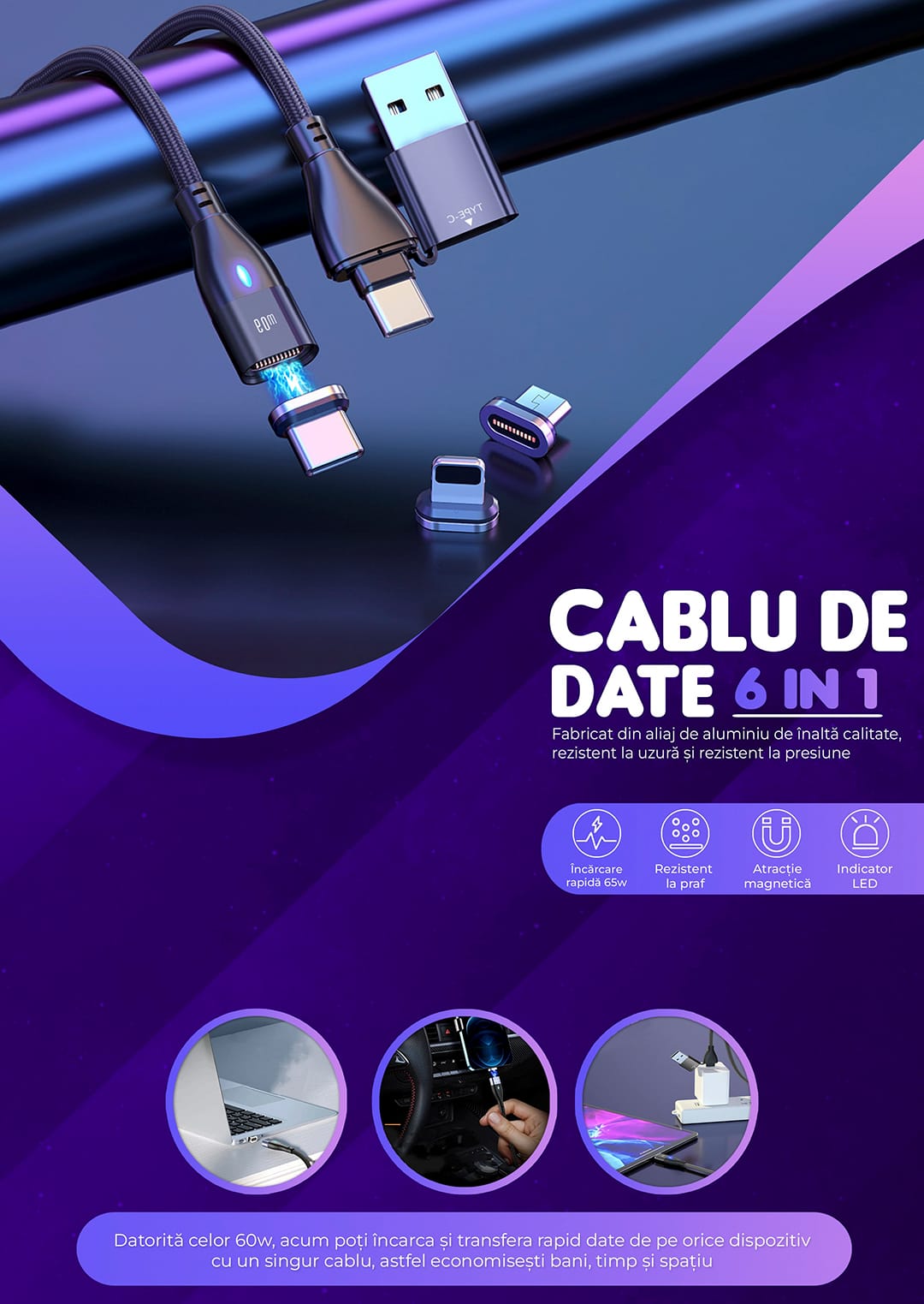 - 6 in 1 Magnetic: Conectori USB, Type-C, Lightning, Micro-USB.