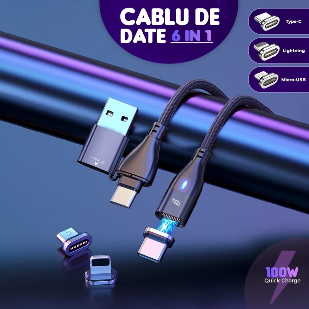 Cablu de date si Incarcare Rapida Timebox, 6 in 1, QC 3.0, 100W, Magnetic, USB, Type-C, Lightning, Micro-USB, Negru