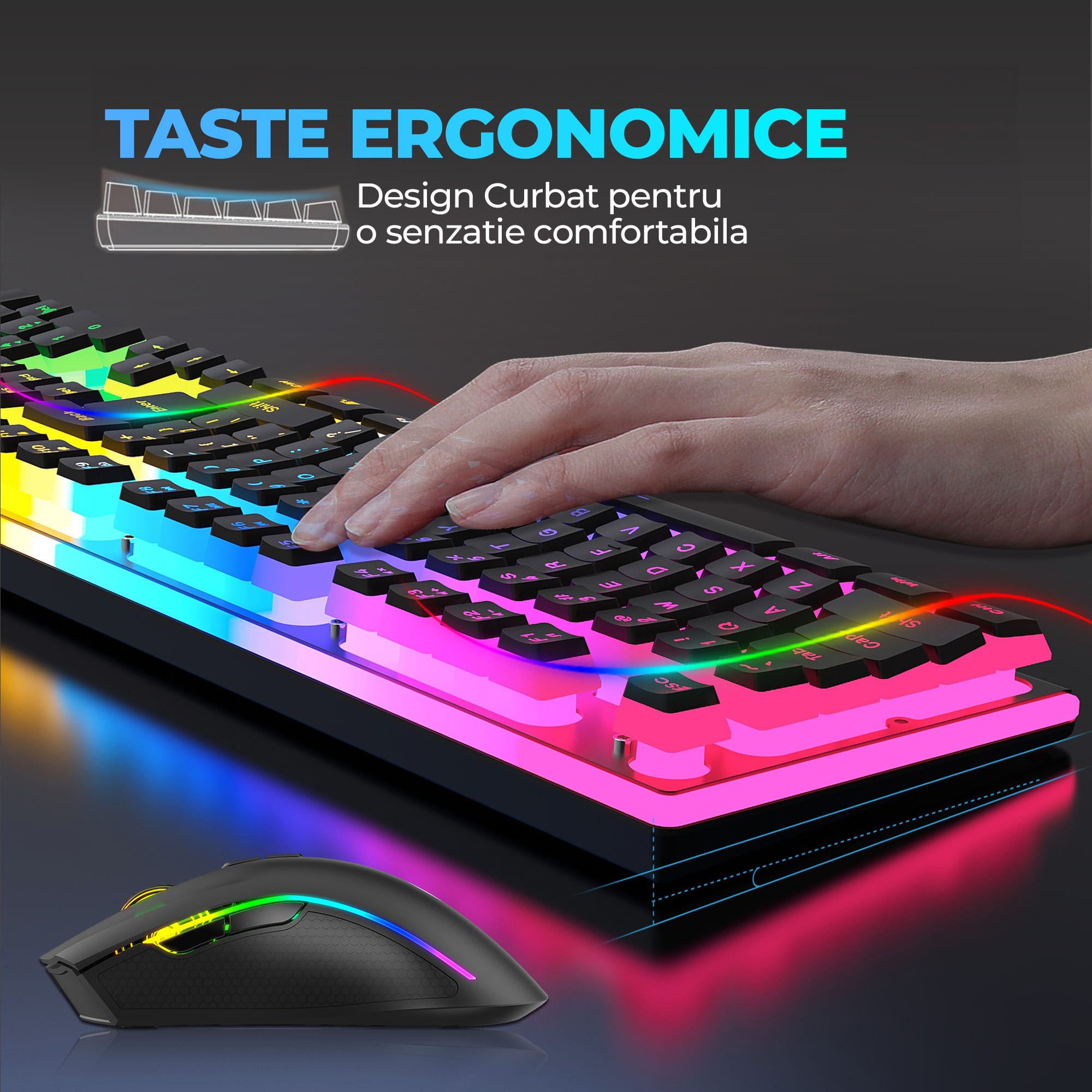 Kit Tastatura, Mouse Gaming, Timebox, RGB, Wireless, 2.4 GHz, 7 culori si moduri de iluminare, 104 taste Design Ergonomic, Negru