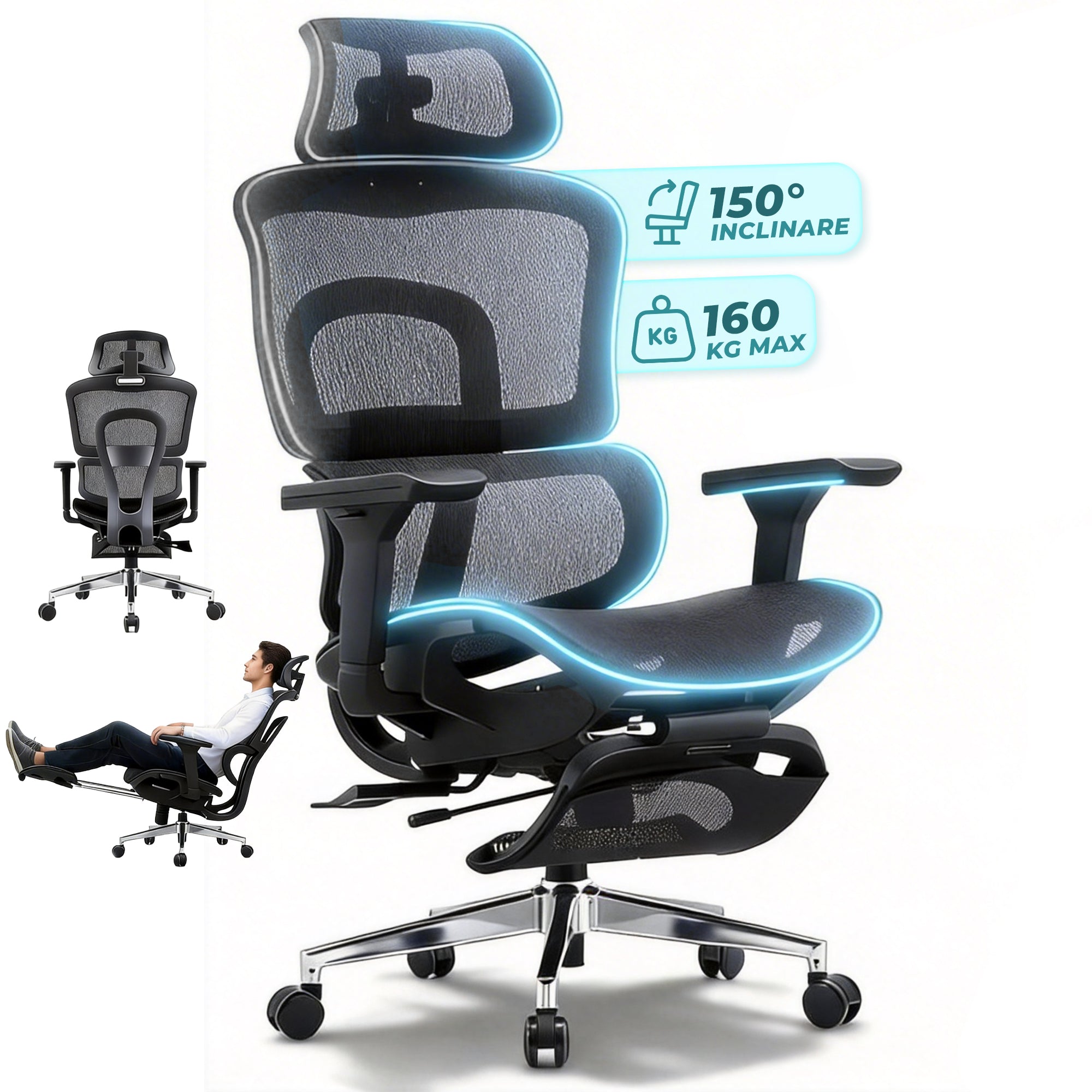 Scaun ergonomic Timebox, Spatar in 6 pozitii 150°, Reglare Inaltime , Cotiere 4D, Plasa Mesh, Profil lombar flexibil, Suport Picioare, Baza din aluminiu durabil, pana la 150 kg, Negru