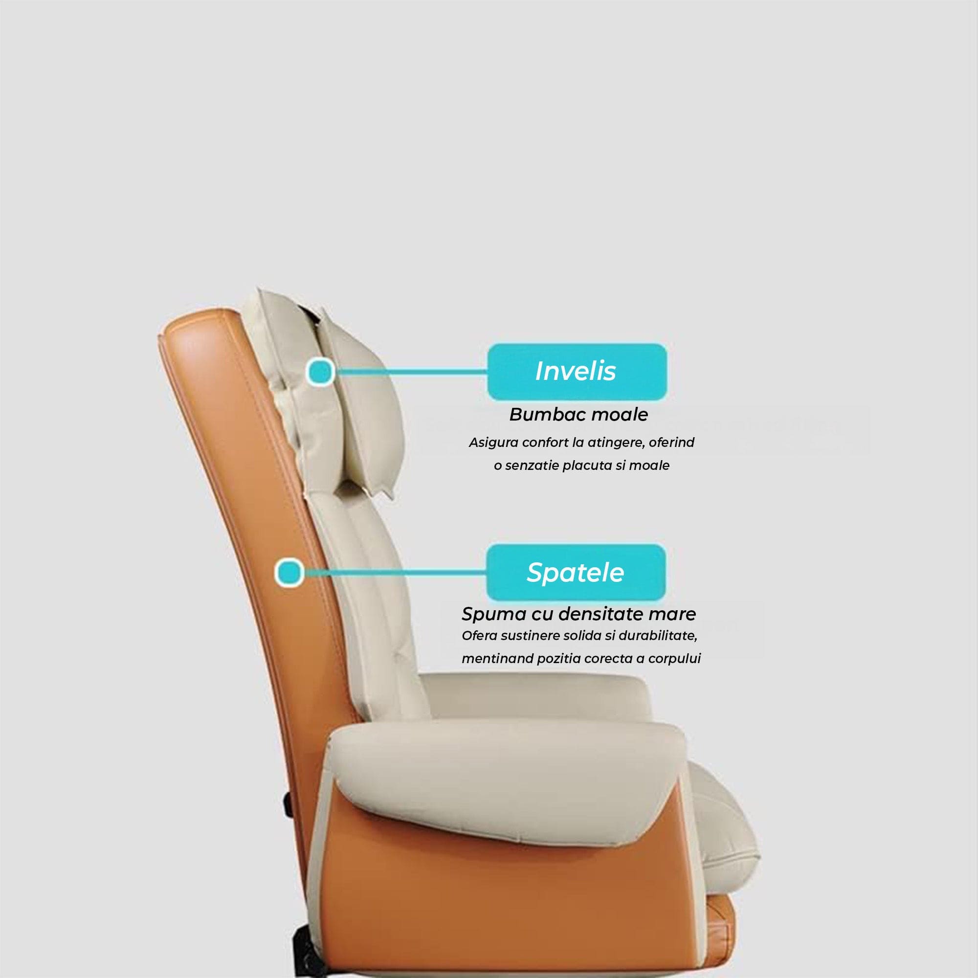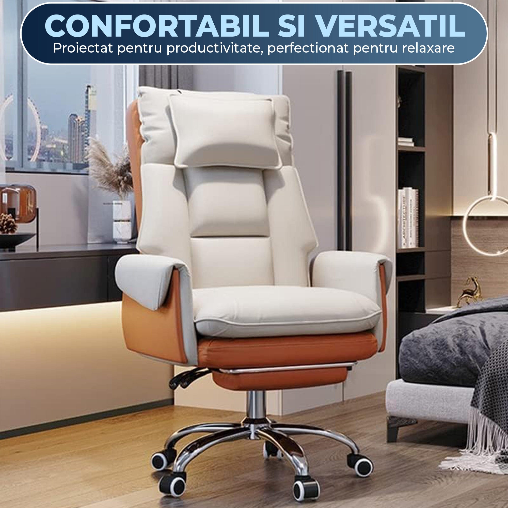 Scaun Birou Timebox cu Suport pentru Picioare – Spatar Inalt, Piele Ecologica, Reglaj Inclinare 90°–135°, Cotiere Captusite si Cadru Metalic Rezistent, Design Modern pentru Confort Executiv, Bej