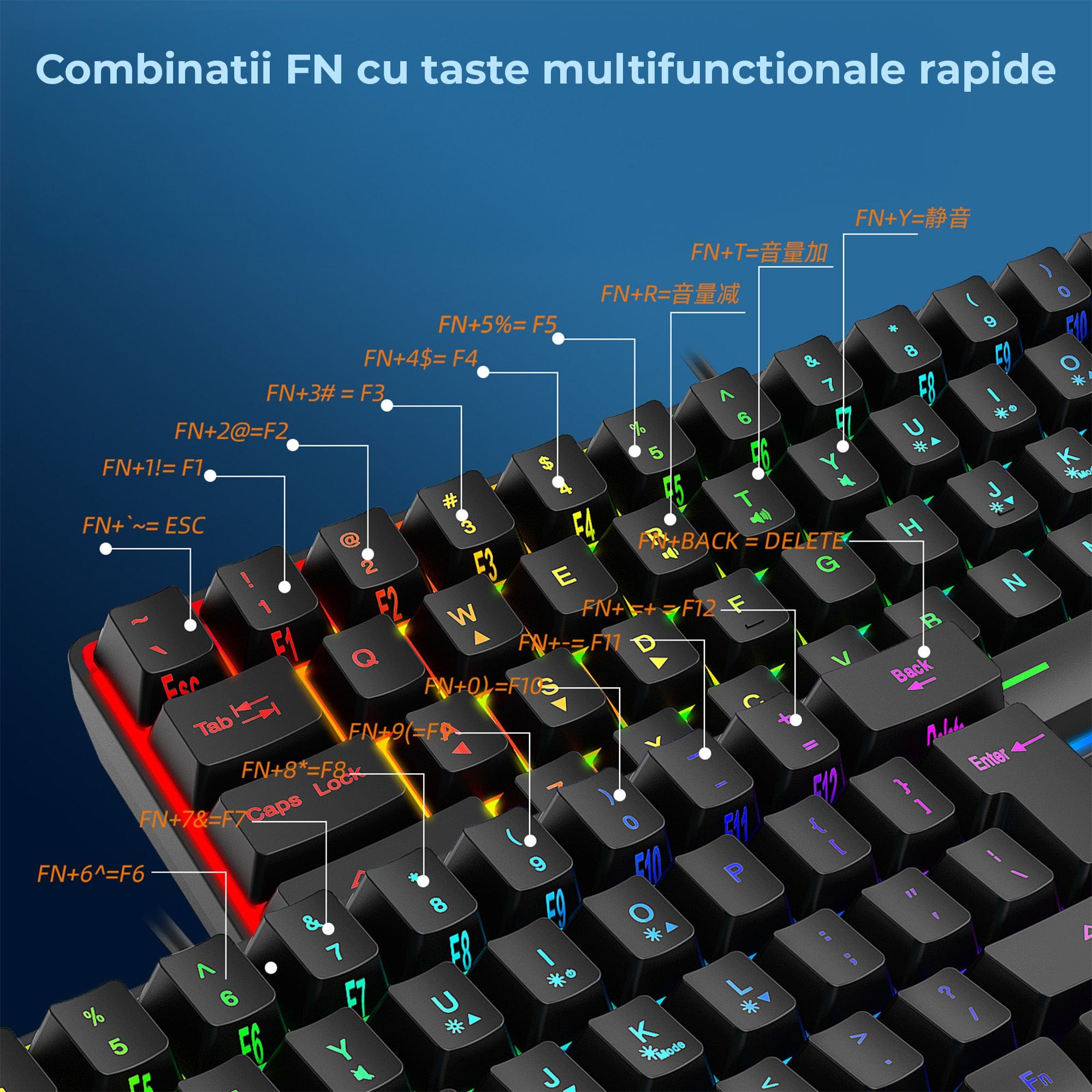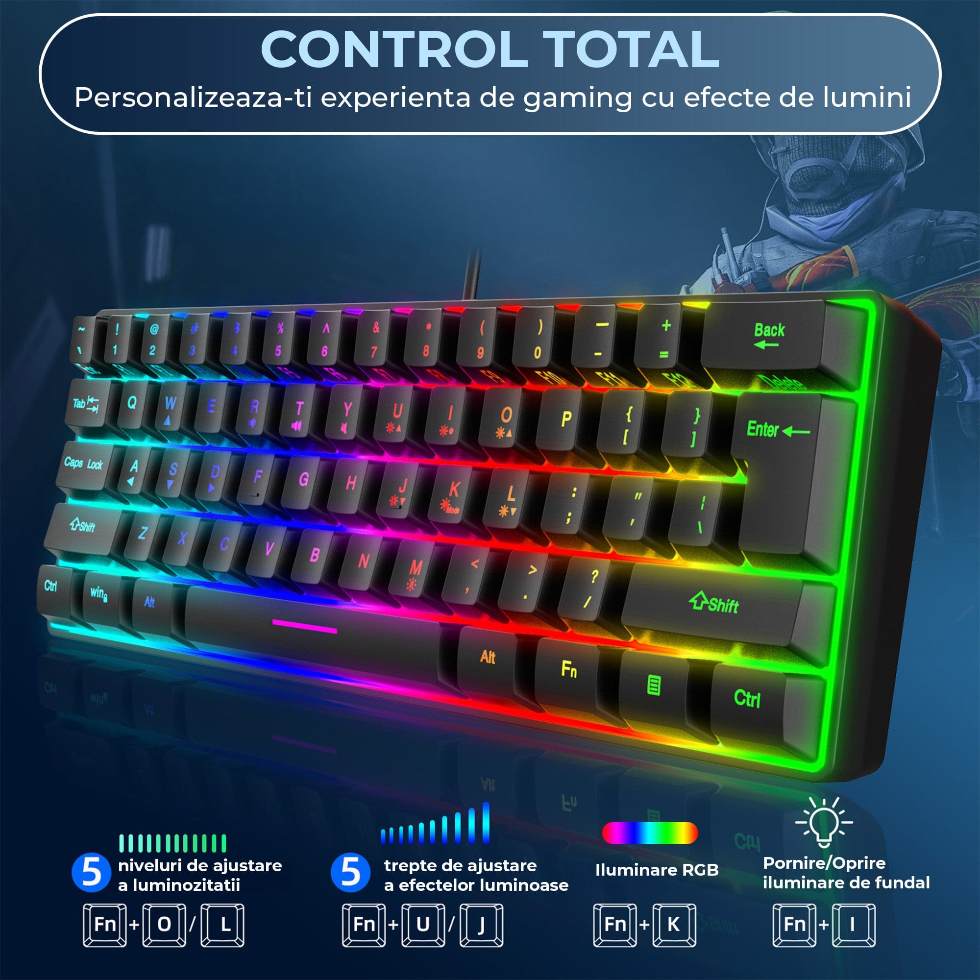 • tastatura adaptata pentru gaming si productivitate: format 60% compact, 8 moduri RGB, anti-ghosting, waterproof, cablu USB 1.5m.
