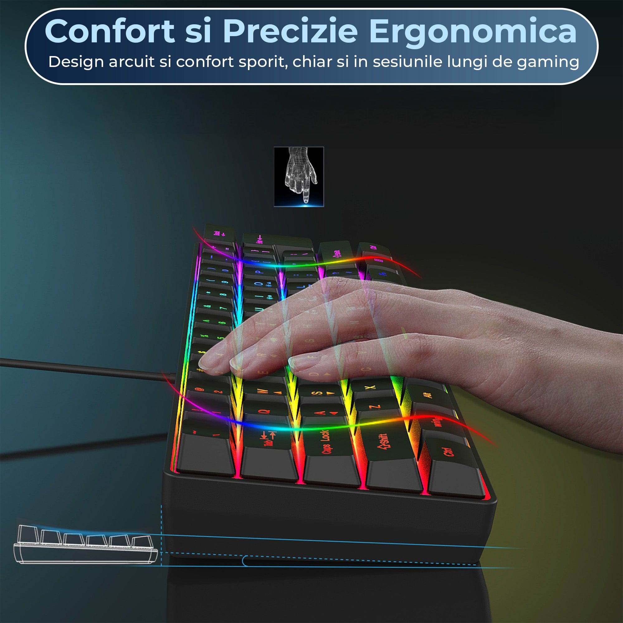 - Compacta si portabila: format 60% cu 61 taste elibereaza spatiu pentru mouse si miscari ample.