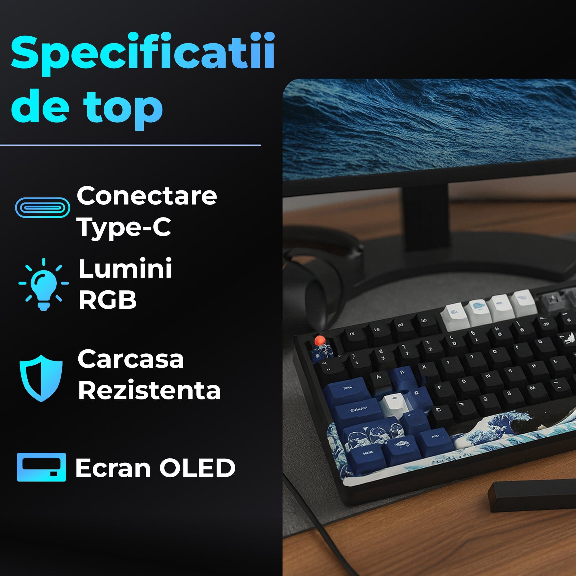 - Compatibilitate: functioneaza pe Mac/Win, cu comenzi si keycaps gandite ergonomic.
