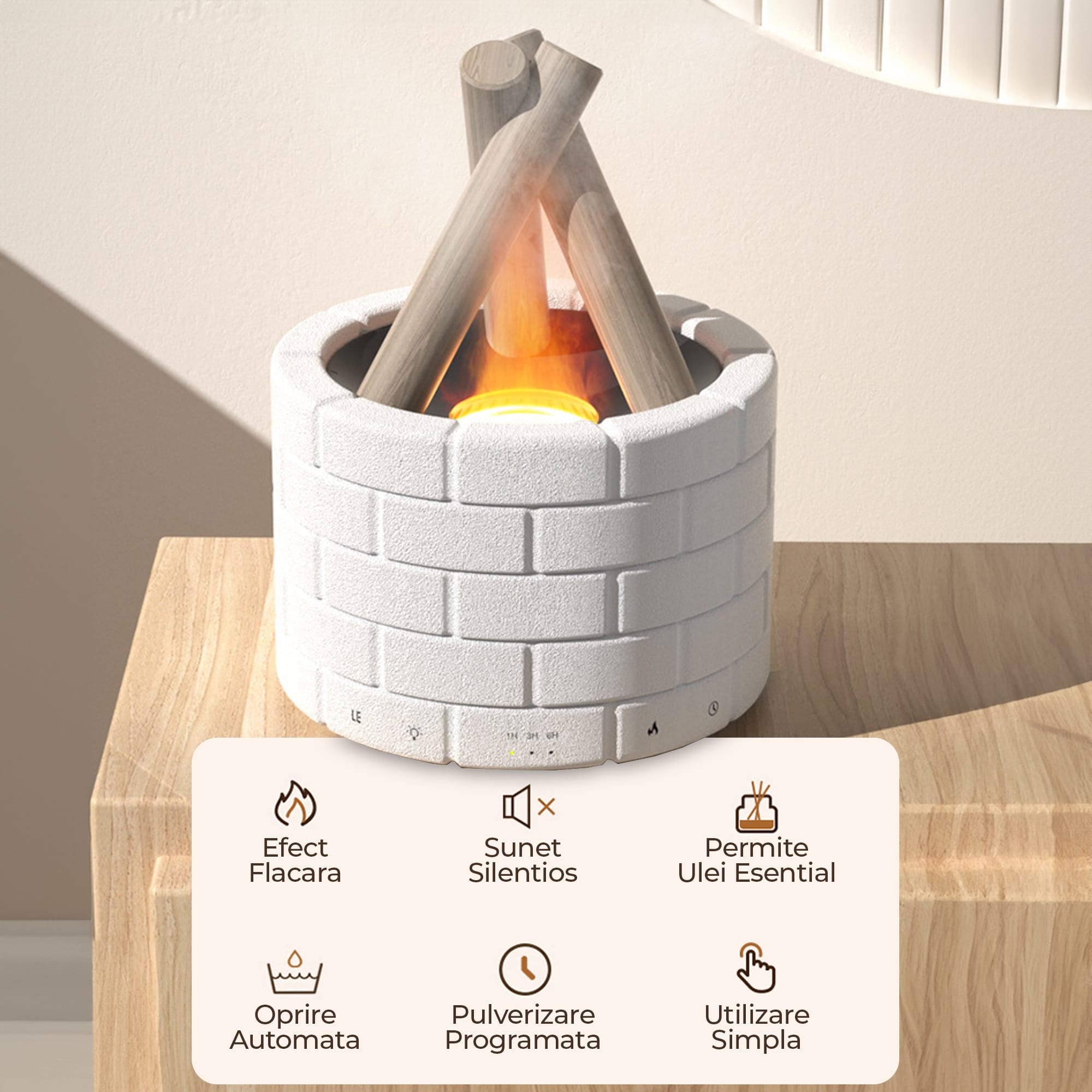 Experiență Aromaterapeutică Relaxantă: Cu designul său unic care evocă atmosfera unei focare, acest difuzor de ulei esențial aduce o notă de caldură și confort în orice încăpere. Îmbogățește atmosfera cu arome plăcute și creează un mediu relaxant pentru odihnă și refacere. Capacitate Optimă: Cu o capacitate de 250ml, acest difuzor este potrivit pentru încăperi de dimensiuni medii și mici. Poți să te bucuri de aromele uleiurilor esențiale preferate pentru o perioadă îndelungată, fără a fi nevoie să reumpli recipientul prea des. Funcție de Auto-oprire: Difuzorul este dotat cu o funcție de auto-oprire care îl întrerupe automat atunci când nivelul de apă scade sub un anumit prag, asigurându-se că dispozitivul este în siguranță și protejându-l de supraîncălzire. Temporizator Programabil: Cu ajutorul telecomenzii incluse, poți seta un temporizator pentru a programa durata de funcționare a difuzorului. Acest lucru îți oferă controlul asupra experienței tale de aromaterapie, permițându-ți să te relaxezi fără a te îngrijora de oprirea difuzorului. Perfect pentru Diverse Medii: Potrivit pentru utilizare în dormitor, birou, living sau orice alt spațiu în care dorești să creezi o atmosferă relaxantă și reconfortantă. Indiferent de locul în care îl plasezi, acest difuzor de ulei esențial adaugă un element decorativ plăcut și funcțional. Design Eleganță Alb: Cu un finisaj alb elegant și designul său stilizat, difuzorul se integrează ușor în orice decor interior, completând estetica încăperii tale cu o notă de rafinament și eleganță.