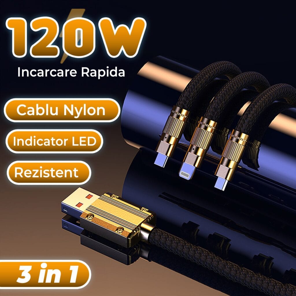 Cablu Date si Incarcare Rapida Timebox, 3 in 1, QC 3,0, 120W, USB, USB-C, Lightning, 1,2m, Nilon, Negru