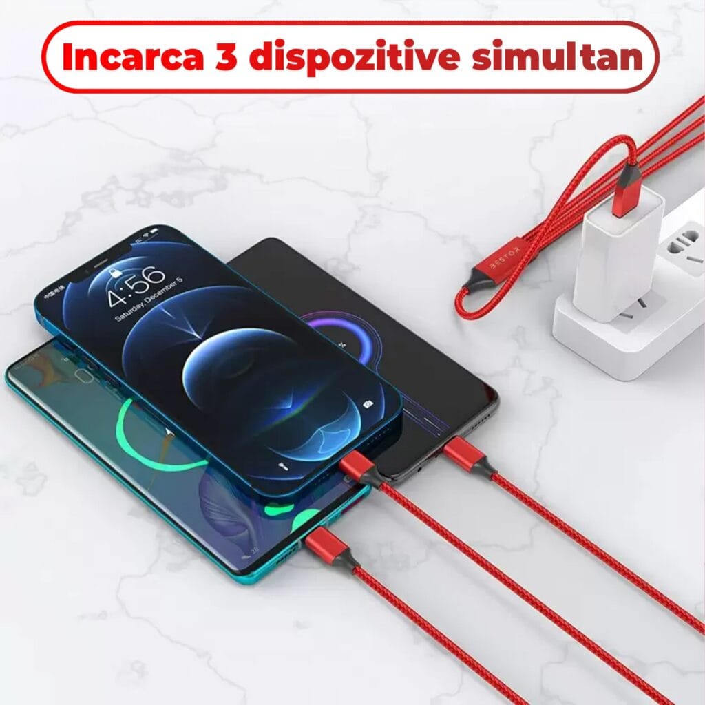 • Tip de cablu: 3 in 1- USB-C, USB, Lightning, compatibil cu majoritatea dispozitivelor.