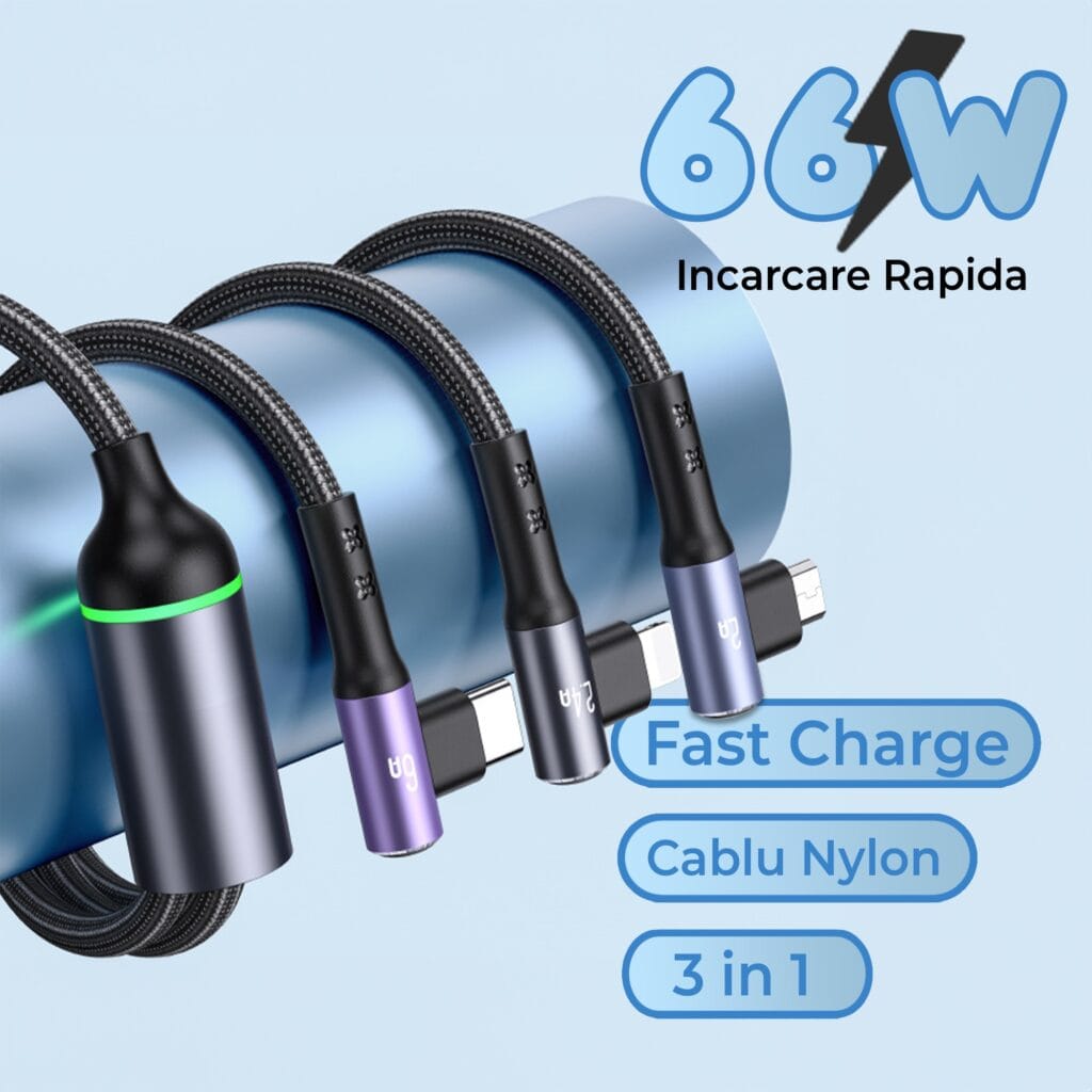 - Tip de cablu: 3 in 1 - USB, Type-C, Lightning, Micro-USB.