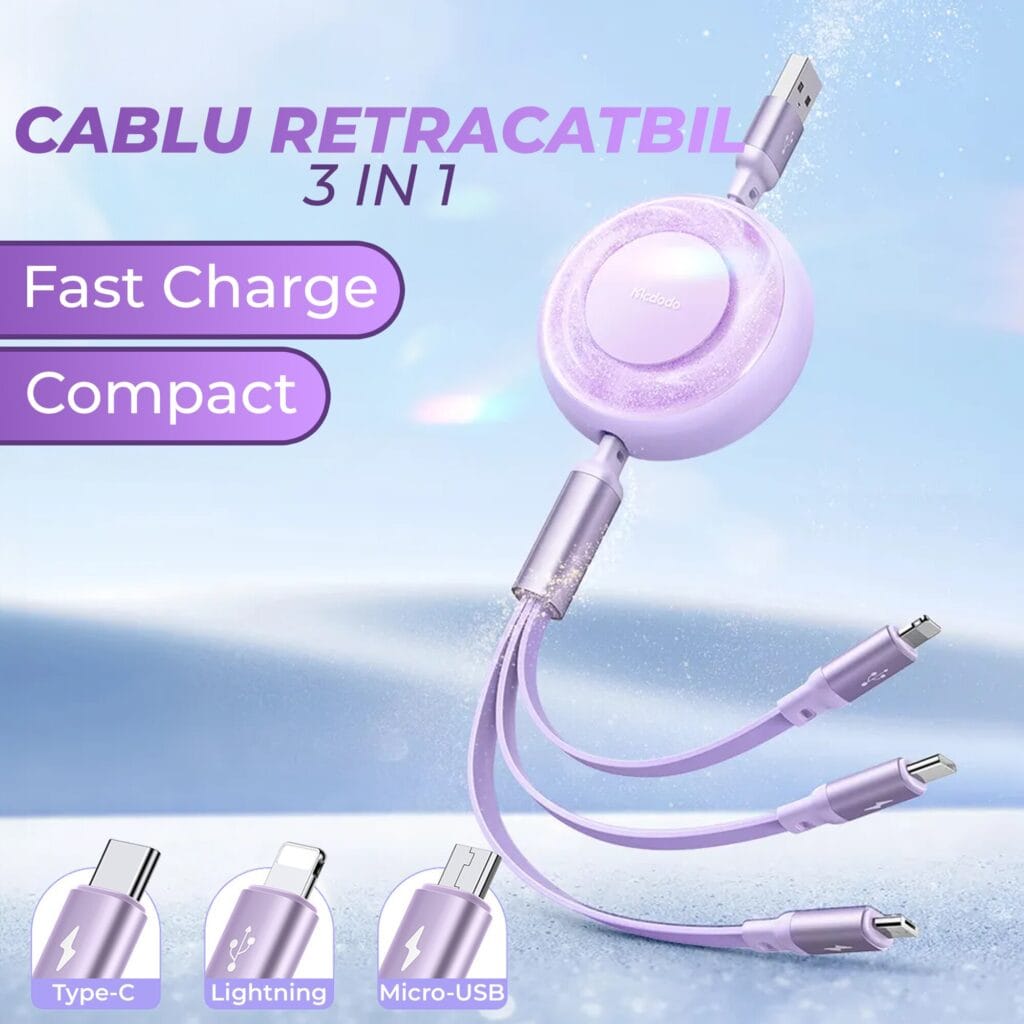 - Conectivitate Multiplă: Include conectori Type-C, Lightning și Micro-USB.
