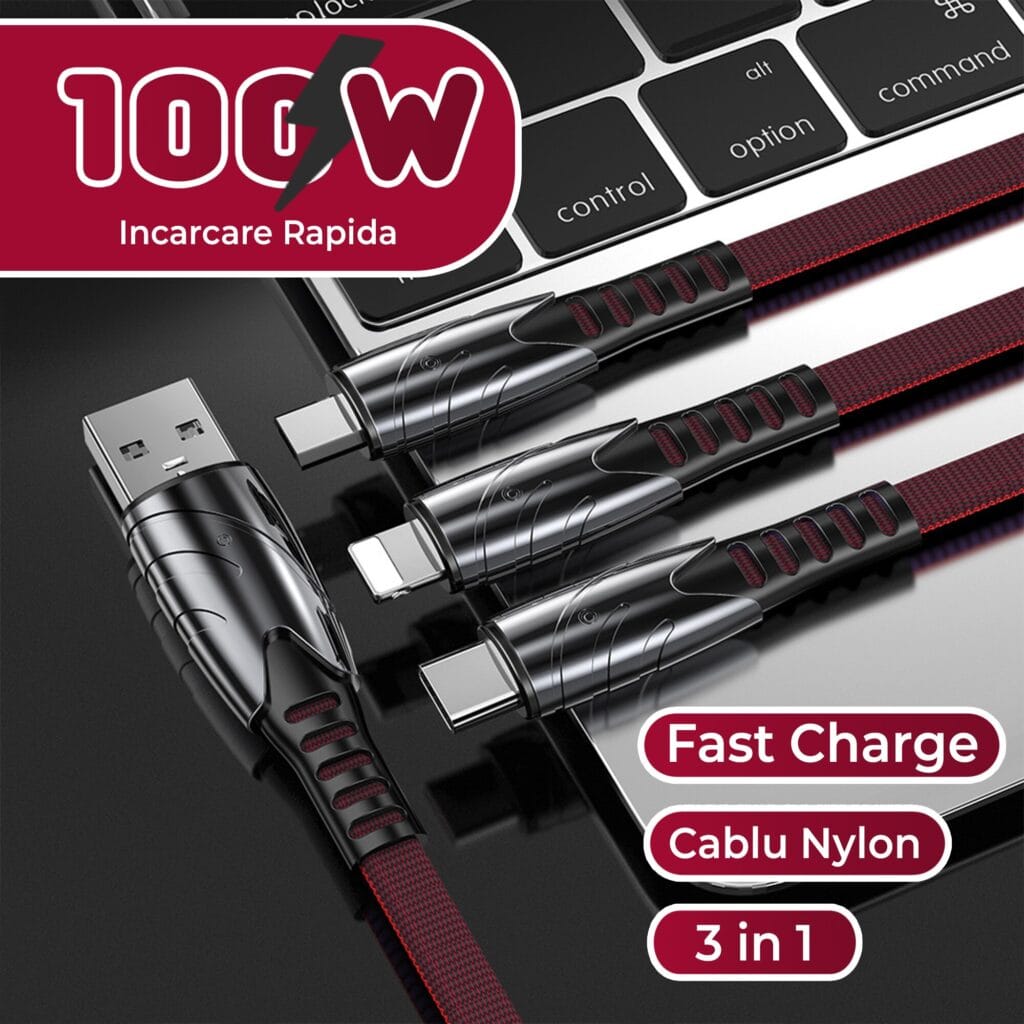 Cablu de date si Incarcare Rapida Timebox, 3 in 1, Nailon, Super Fast Charge 120W, USB, Lightning, Type-C, Micro-USB, Rosu