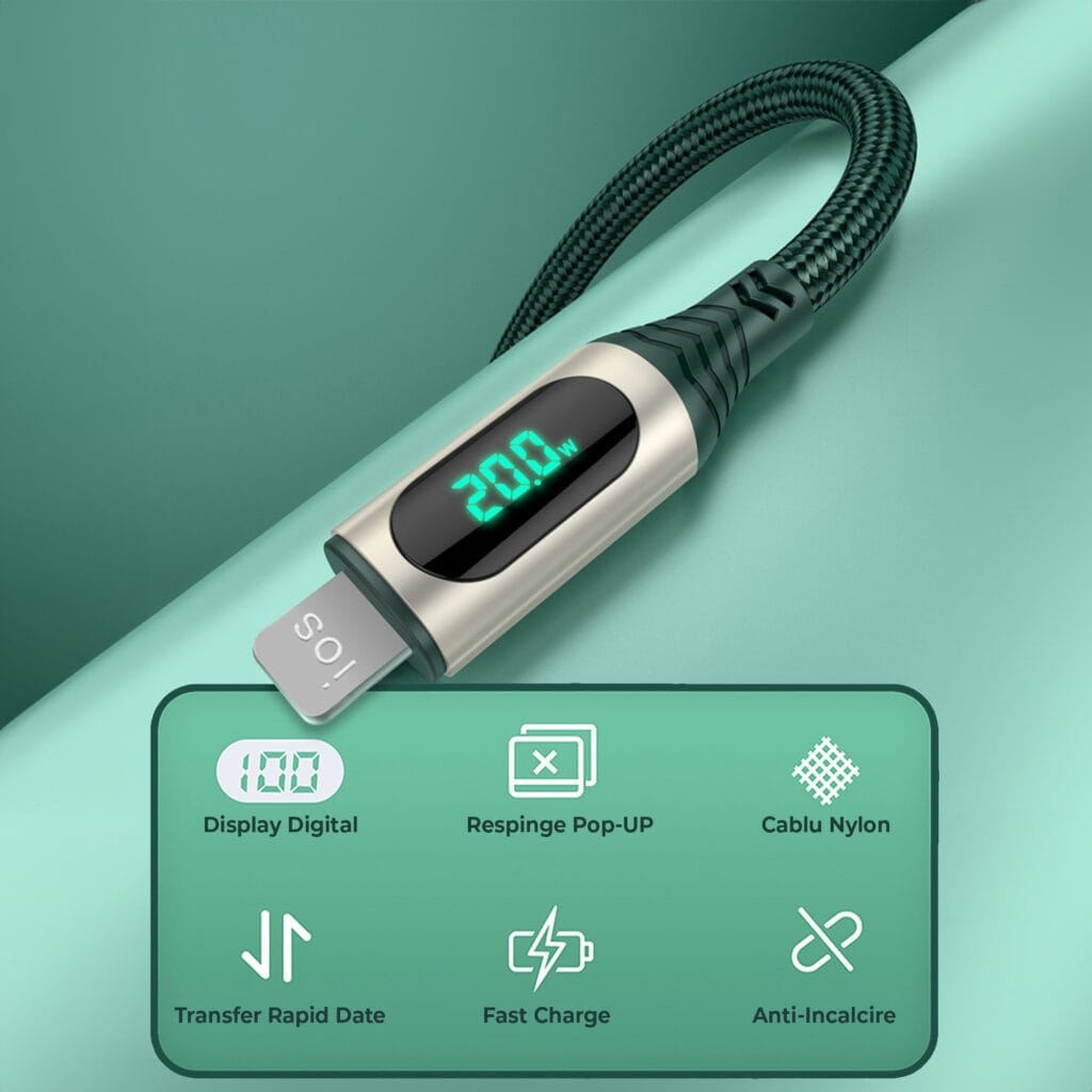 Cablu Date si Incarcare Rapida Timebox, Afisaj Led, QC 3,0, Lightning, 1m, Verde